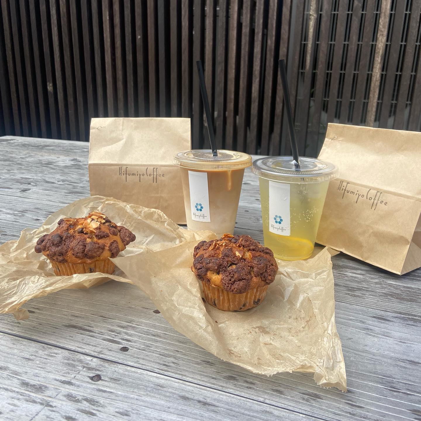 直島の島カフェ、ヒフミヨ珈琲舎。自家製レモネードと共に、しっとり生地のピーナツバター&チョコチップマフィンを楽しめます。ピーナツの濃厚さとチョコの相性が際立つ、落ち着いた雰囲気が魅力です。