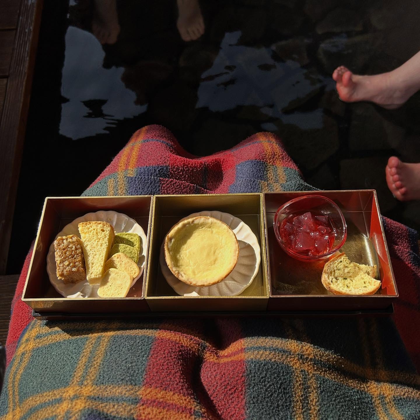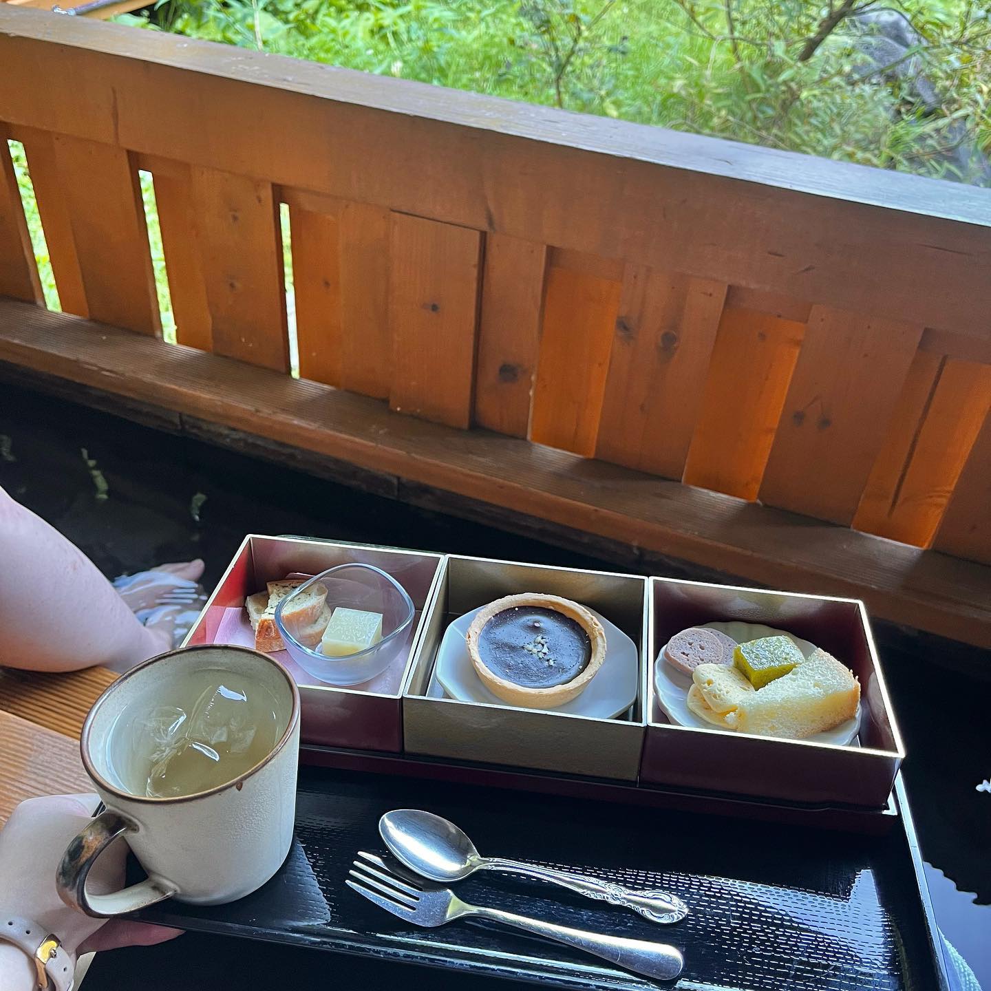 足湯に浸かりながらのスイーツ、贅沢。...
