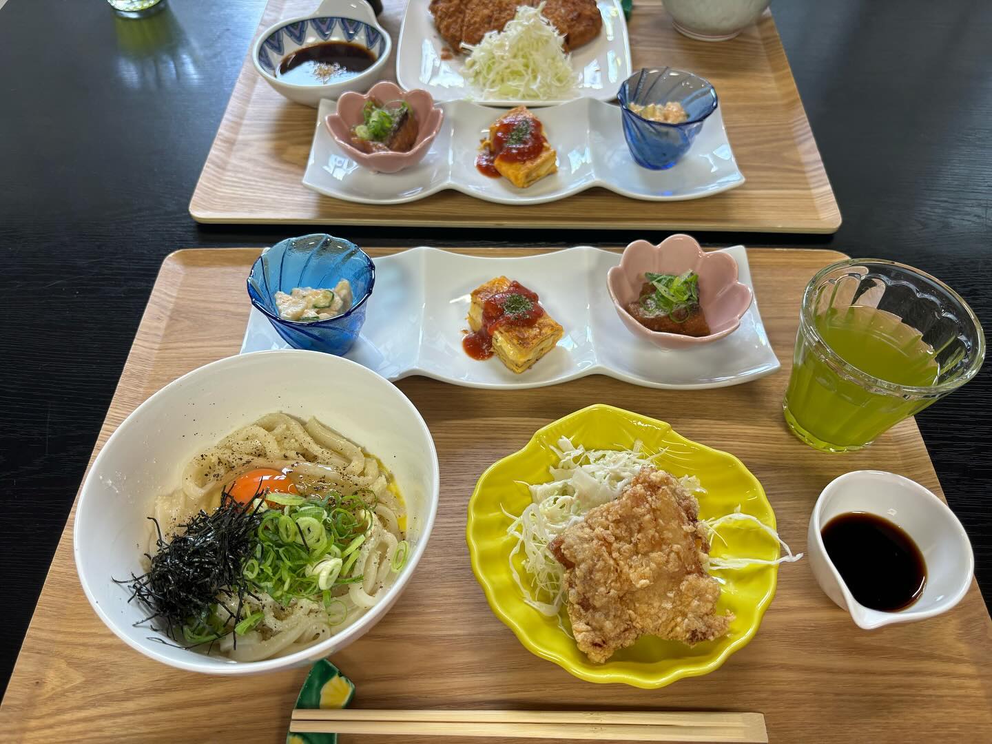 #栄喜屋#カルボまぜうどん#唐揚げ#ポテトサラダ#卵焼き#南蛮#とんかつ#お味噌汁#赤だし#緑茶#먹방#日々の贅沢#ごちそうさま