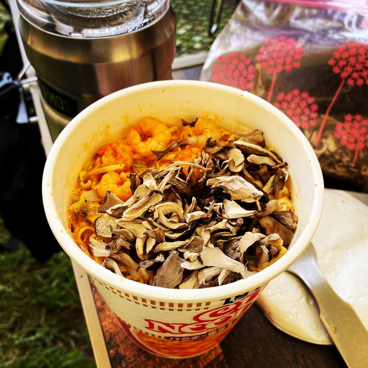 キャンプ🏕ごはん - カップヌードルに追い舞茸🍜❣️La comida de Camping❤︎