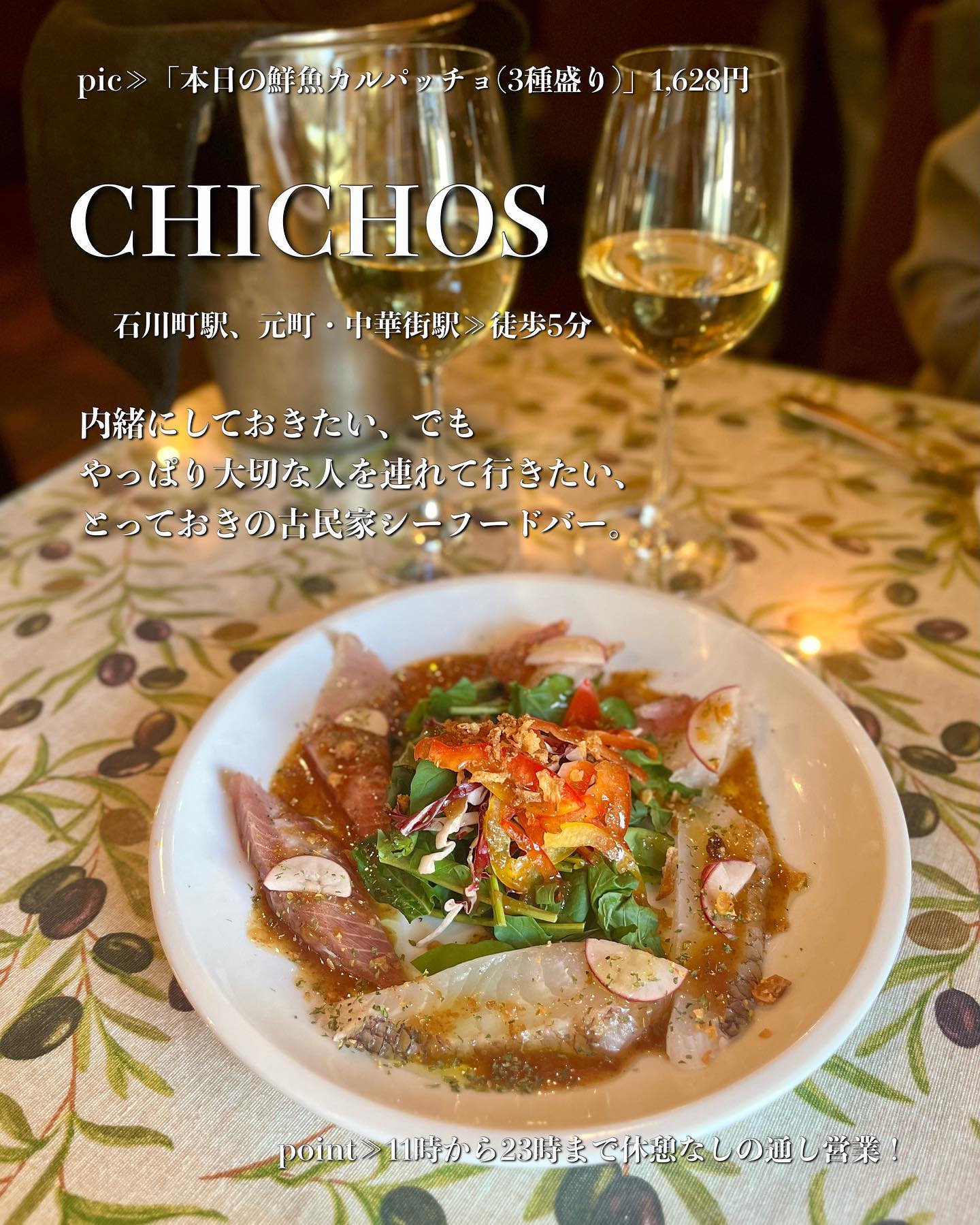 石川町駅近くの真っ白な一軒家を改装した、海鮮を中心としたバー&レストランCHICHOS。通し営業でランチからディナーまで休憩なし、ペット同伴もOK。和と洋が調和する落ち着いた雰囲気が魅力です。