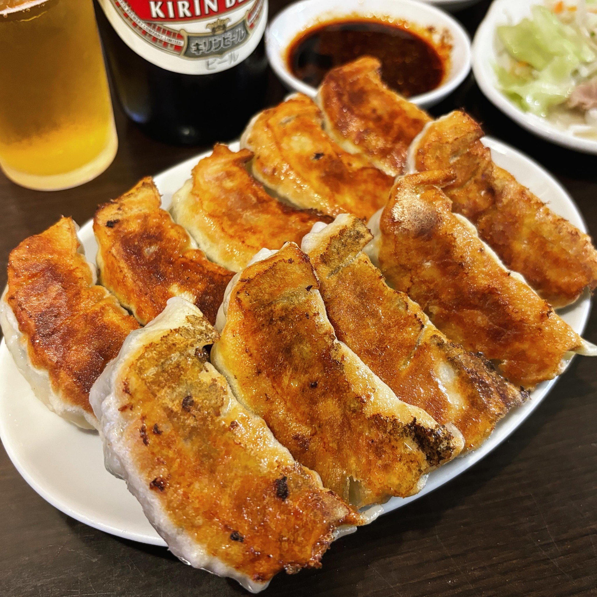木場の餃子の店 来々軒は、焼き目のついたコロンとした餃子にぎっしり餡が特徴です。タンメン発祥のお店としても有名で、餃子とビールの定番に加え、タンメン野菜のサービスと自家製ラー油・鎮江香醋が味を引き立てます。リニューアルした店内はカフェ風で落ち着きます。