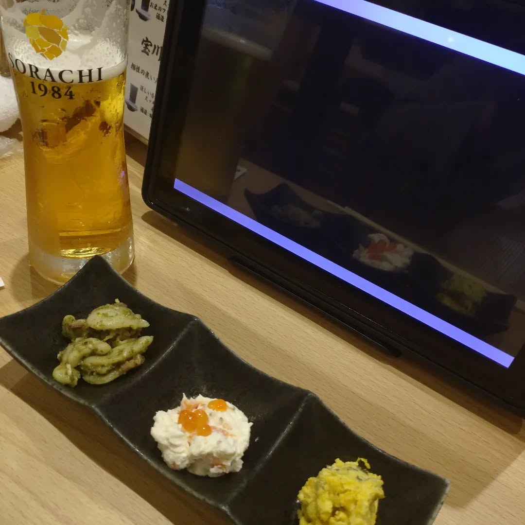@57sushi_tokyo さん。#SORACHI にはまる。おつまみ三種でグビグビ。東京駅黒塀横丁。