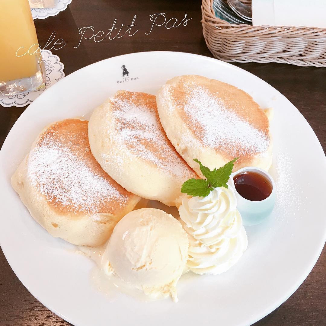 小倉南区のカフェ プティパは、パンケーキを看板にした落ち着いた雰囲気のカフェです。いちごのパンケーキはソース付きで、固めのホットケーキタイプとふわふわの軽いタイプの2種を味わえます。