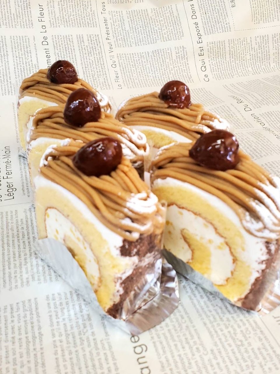 生クリームに栗の甘露煮を入れて巻いた [栗のロールケーキ]と、さつまいもペーストを表面に絞った [おいものブリュレ] が登場で...