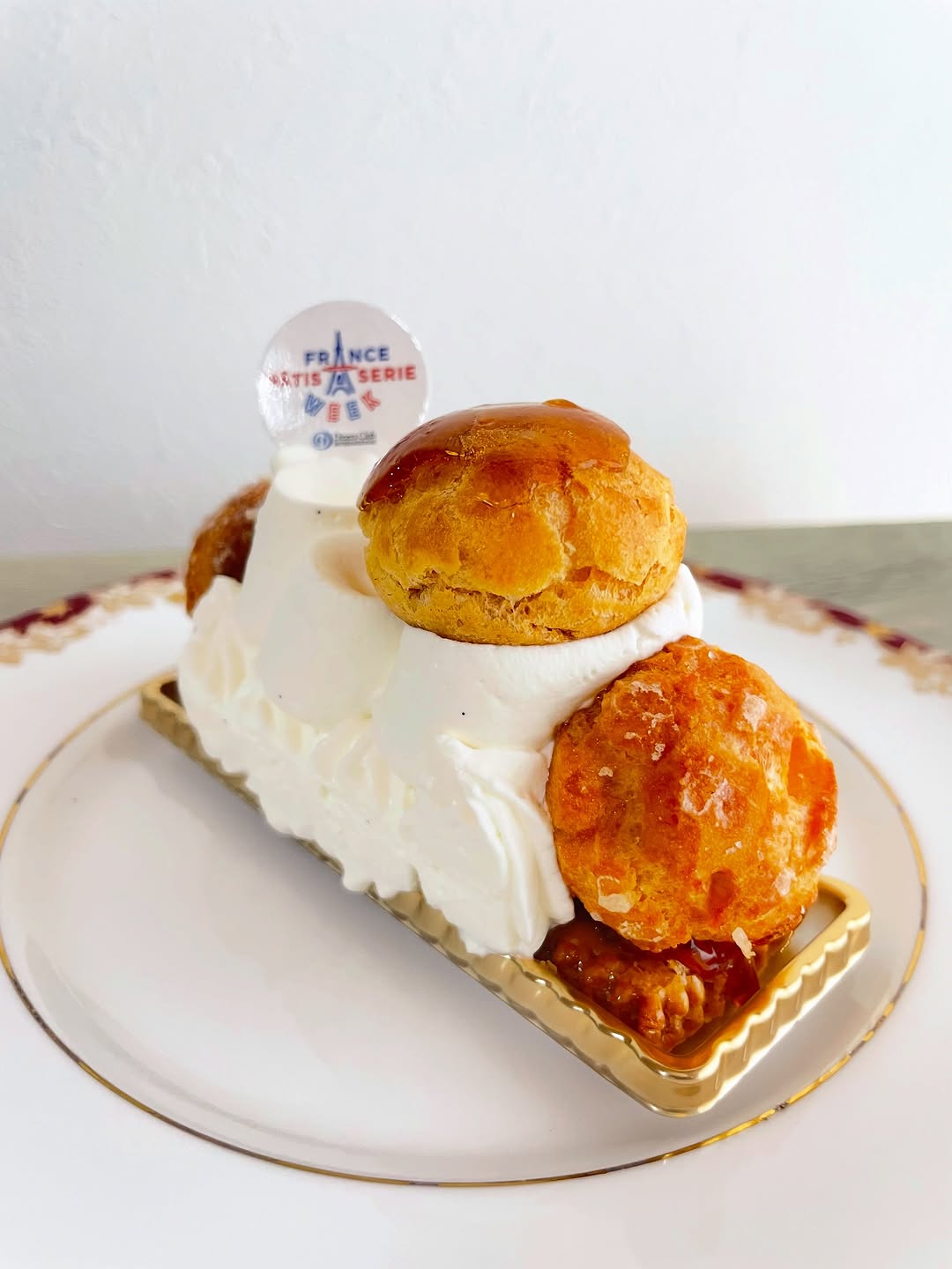 パイ生地の上にカスタード・生クリームを絞り、キャラメリゼしたカスタード入りのシューをのせて仕上げたというシ...