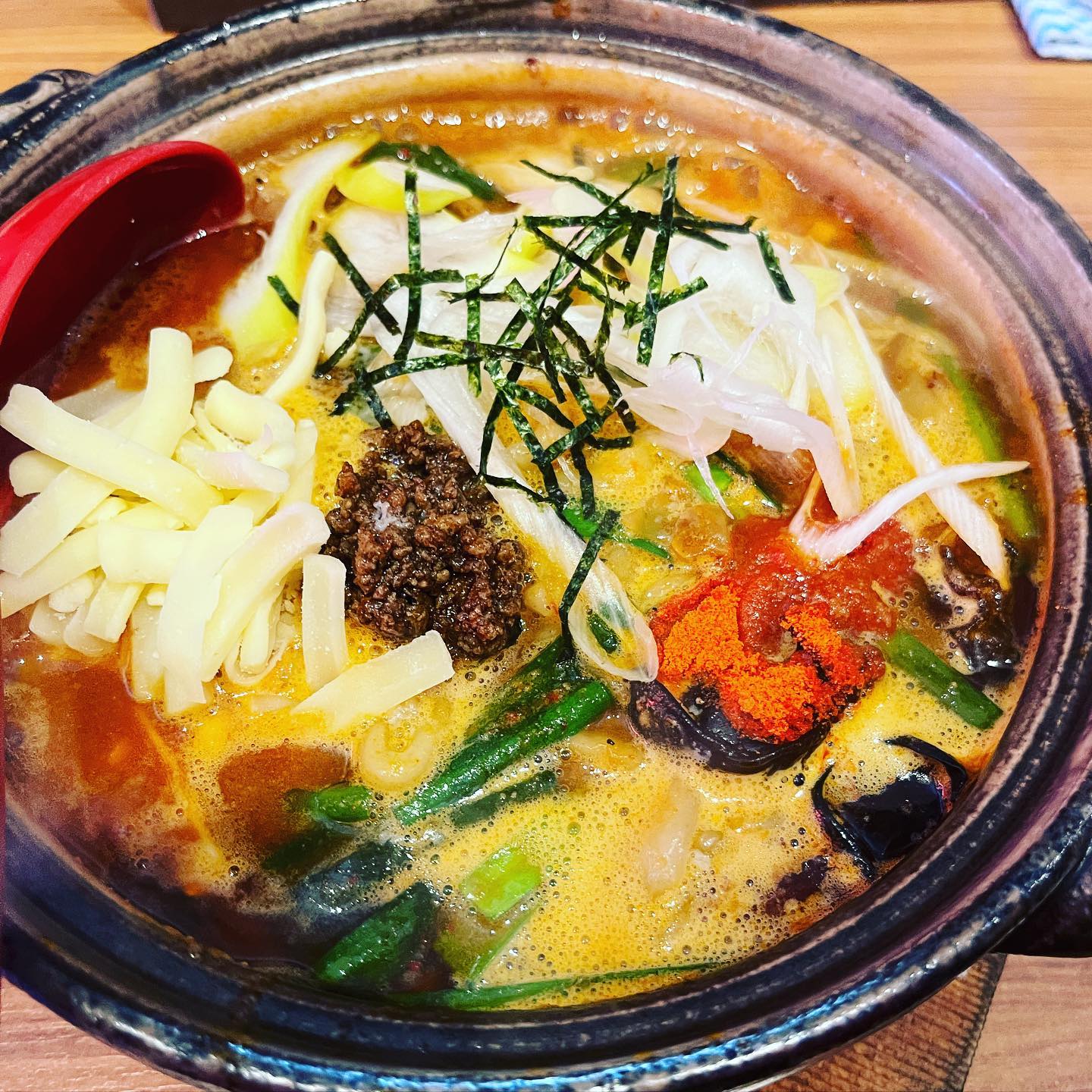 メニューは肉野菜煮込み麺大辛!にトッピングチーズに...