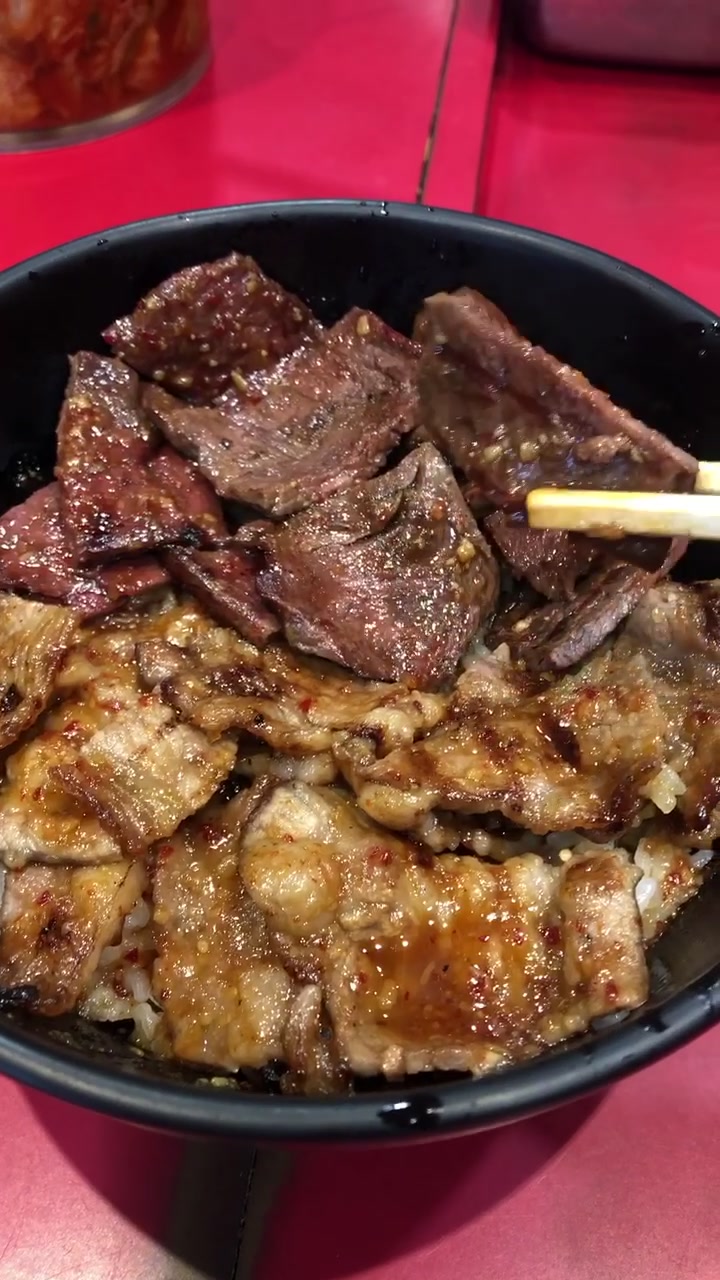 カルビ丼にハラミ肉の皿盛りを注文❗️結局、ハラミとキムチも丼に全部乗せ🤗#tiktokグルメ #今...