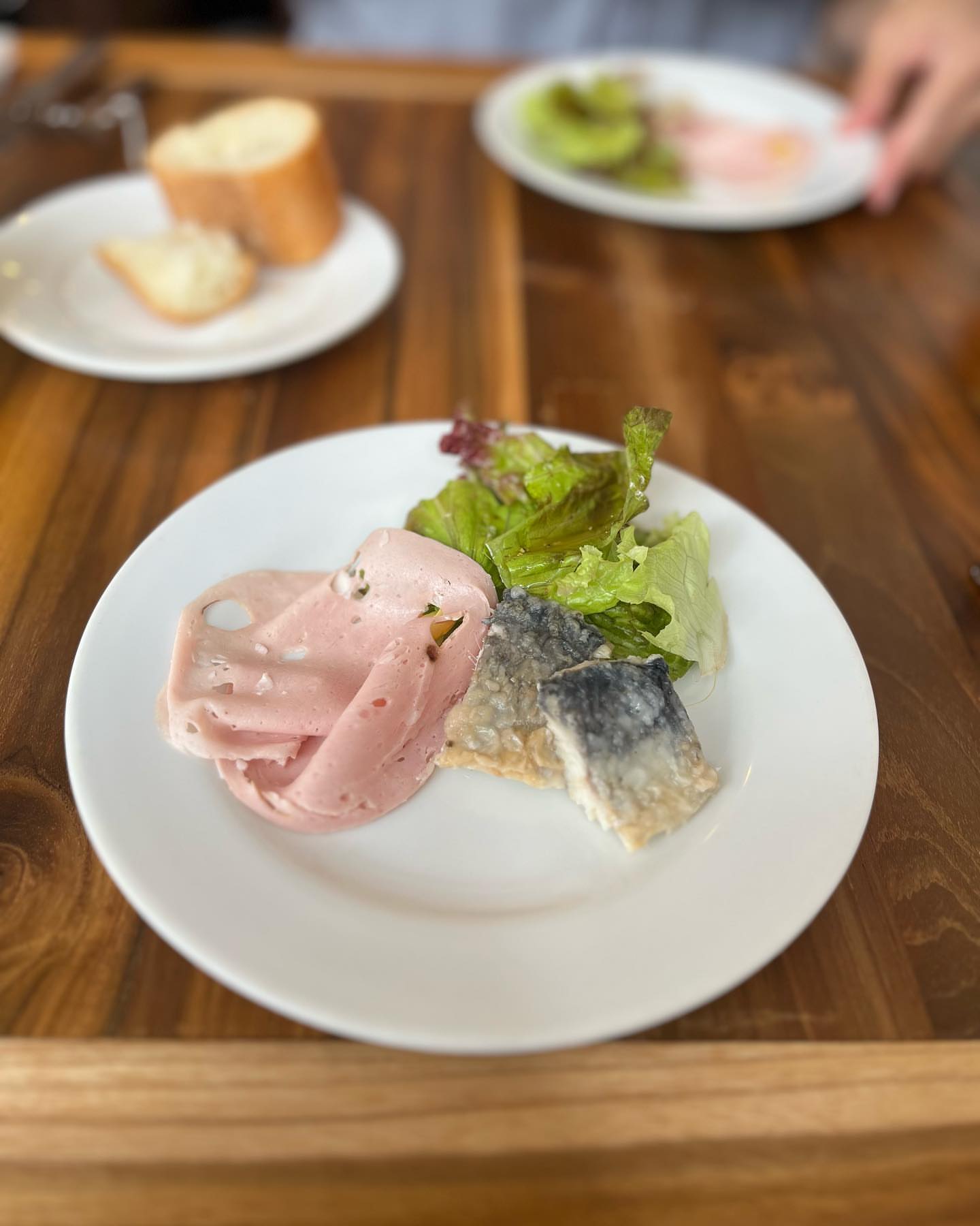 前菜は生ハムとナスの甘酢漬けの入ったサラダ