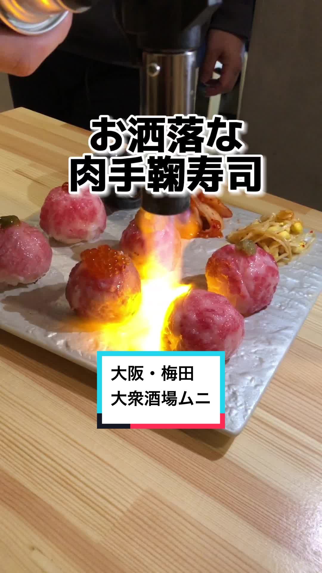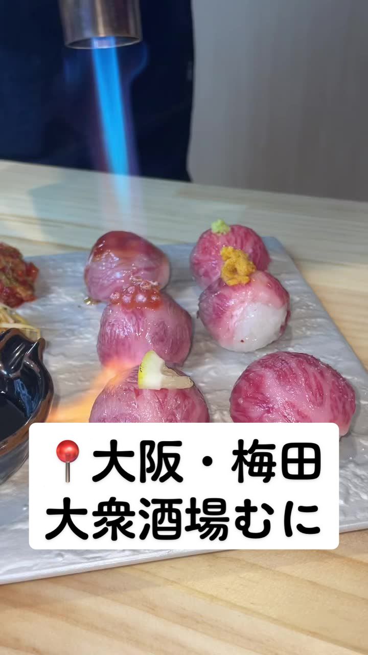 映えまくりの目の前で炙ってくれる肉てまり寿司おすすめです😋🏠大衆酒場むに📍大阪市北区堂山町16-12⏰日〜木17:00〜3:00金土17:00〜5:00#...