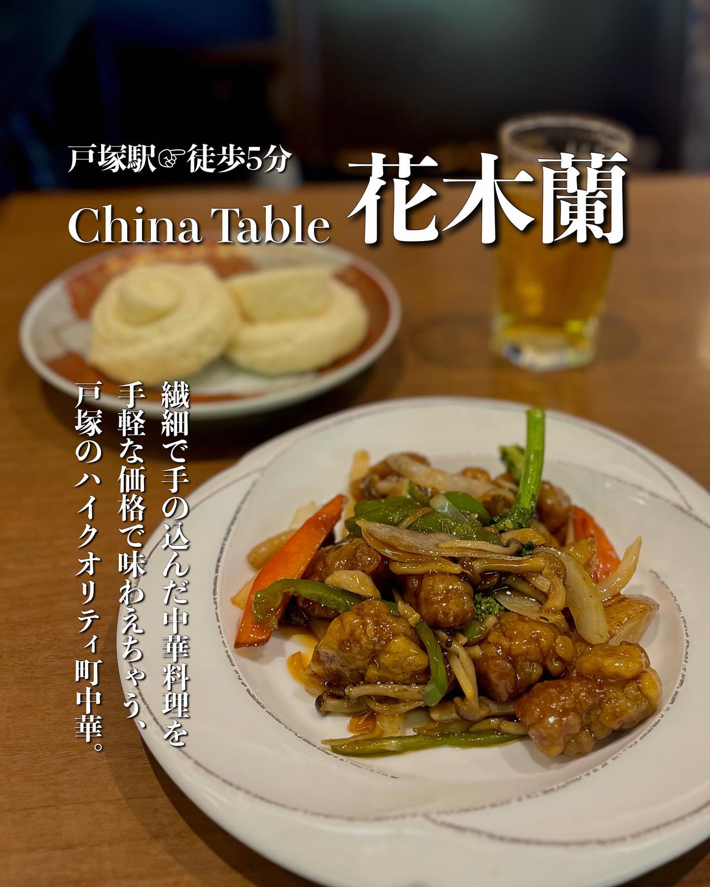 戸塚の花木蘭は、百名店にも選ばれた町中華。高級感ある店内と器にこだわり、ランチセットはサラダ・スープ・デザート付き、ライスまたは蒸しパンおかわり自由。黒酢酢豚・麻婆豆腐・タラバガニ入りフカヒレ麺など上質な味わいで、蒸しパンは特に絶品。