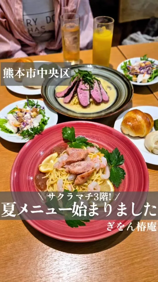 熊本・サクラマチ3階の生パスタ専門店「ぎをん椿庵」。冷製パスタを中心に出汁と和風の味わいを活かした創作パスタが特徴です。パン食べ放題のセットも話題。おしゃれな店内で子ども向けのパスタセットも用意されています。