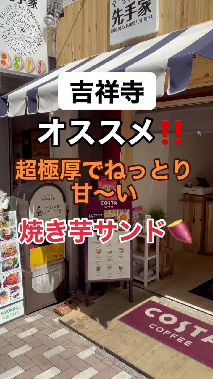 吉祥寺パルコ1階の先手家は、八百屋が運営するフルーツサンドと焼きいもサンドの名店です。薄いパンにねっとり焼きいもと控えめなクリームを組み合わせ、圧倒的なボリュームと果実の大きさが魅力。売り切れ情報はSNSで要チェック、テイクアウトも可能です。