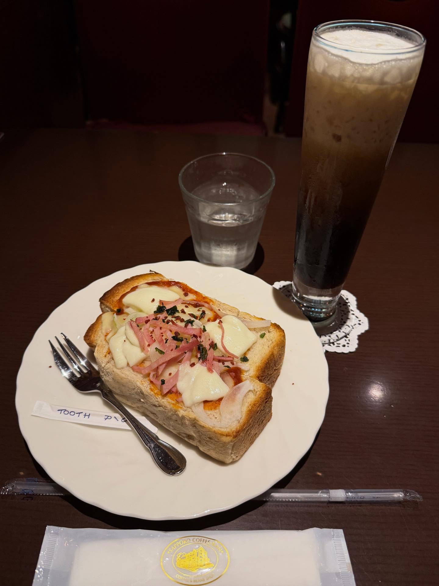 仕事の帰り、小腹がすいたので、アイスカフェオレとピザトーストをいただく😅