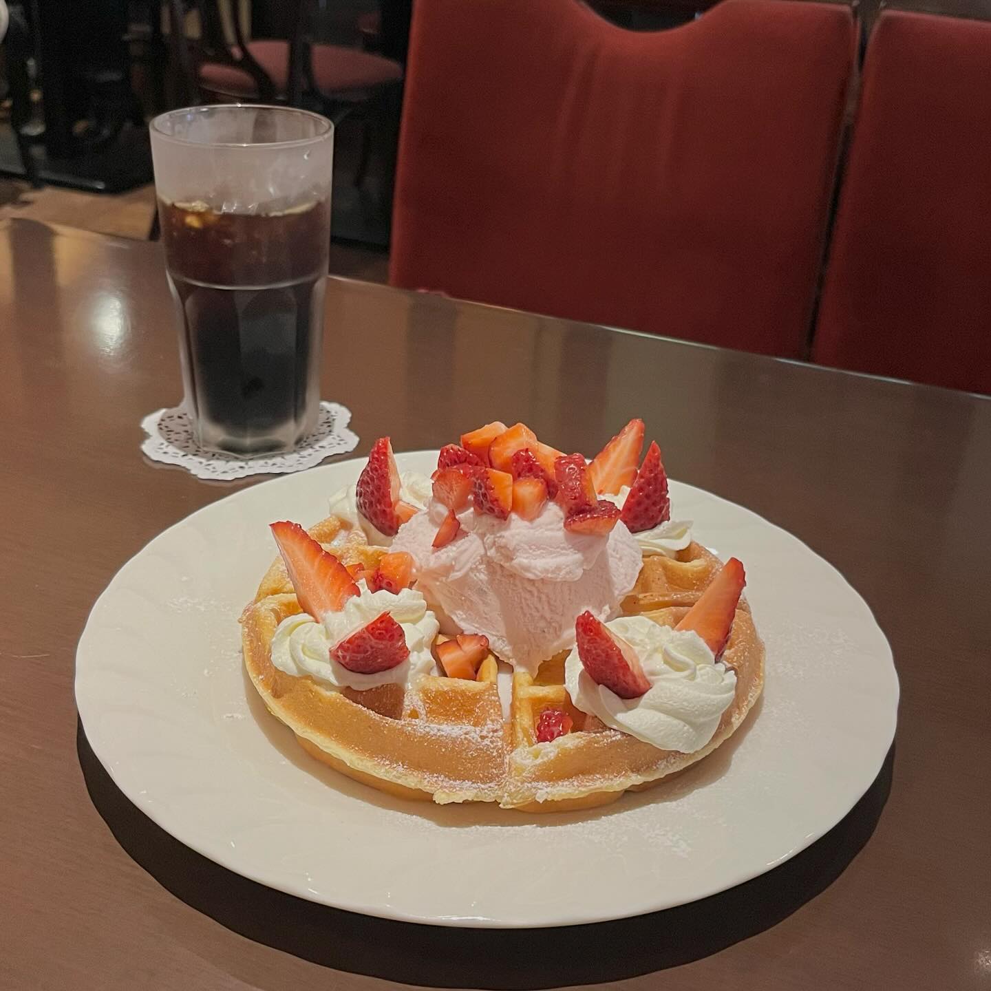 珈琲館さんの春のワッフル。やさしいふんわりとした生地に、生クリーム、さくらのアイス、いちご。どこか懐かしい味わい💭