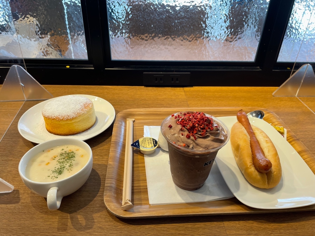 全国に店舗を持つKEY'S CAFEは、秋葉原駅徒歩1分の立地にあり、厚み約4cmのふわふわスフレパンケーキが自慢です。コンセント付きカウンターと磨りガラスの対面席で、待ち合わせにも最適。価格は460円のパンケーキが手頃です。