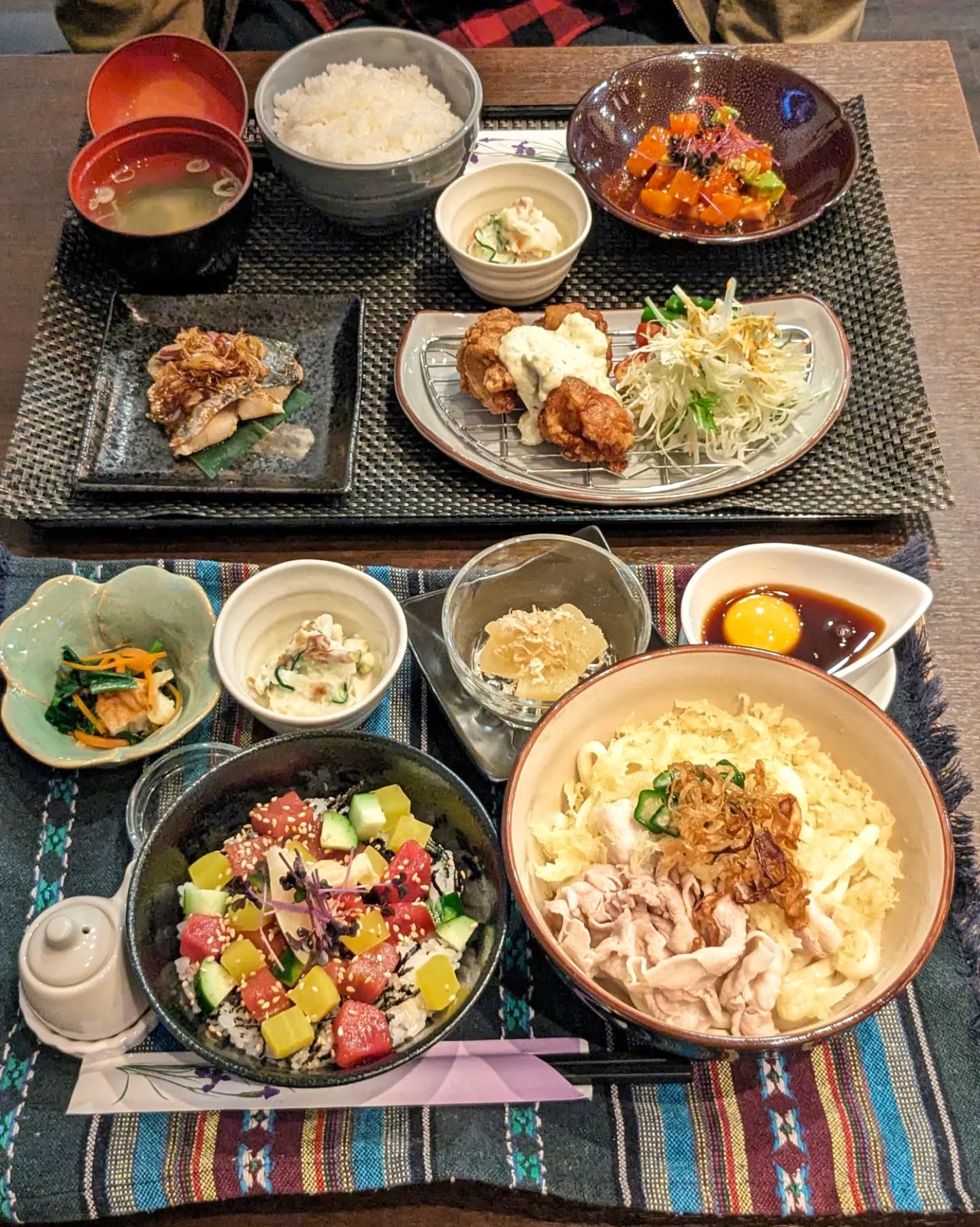 ▫チキン南蛮風鶏ザンギとサーモンとアボカドのユッケと鰆の香味しょうゆ焼き