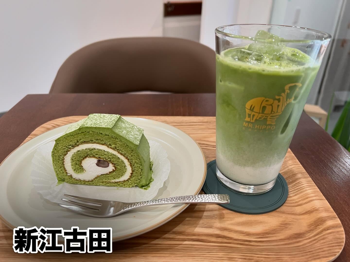東京新江古田駅前にあるMR.HIPPO COFFEEで、抹茶のロールケーキと宇治抹茶ラテ(無糖)を注...
