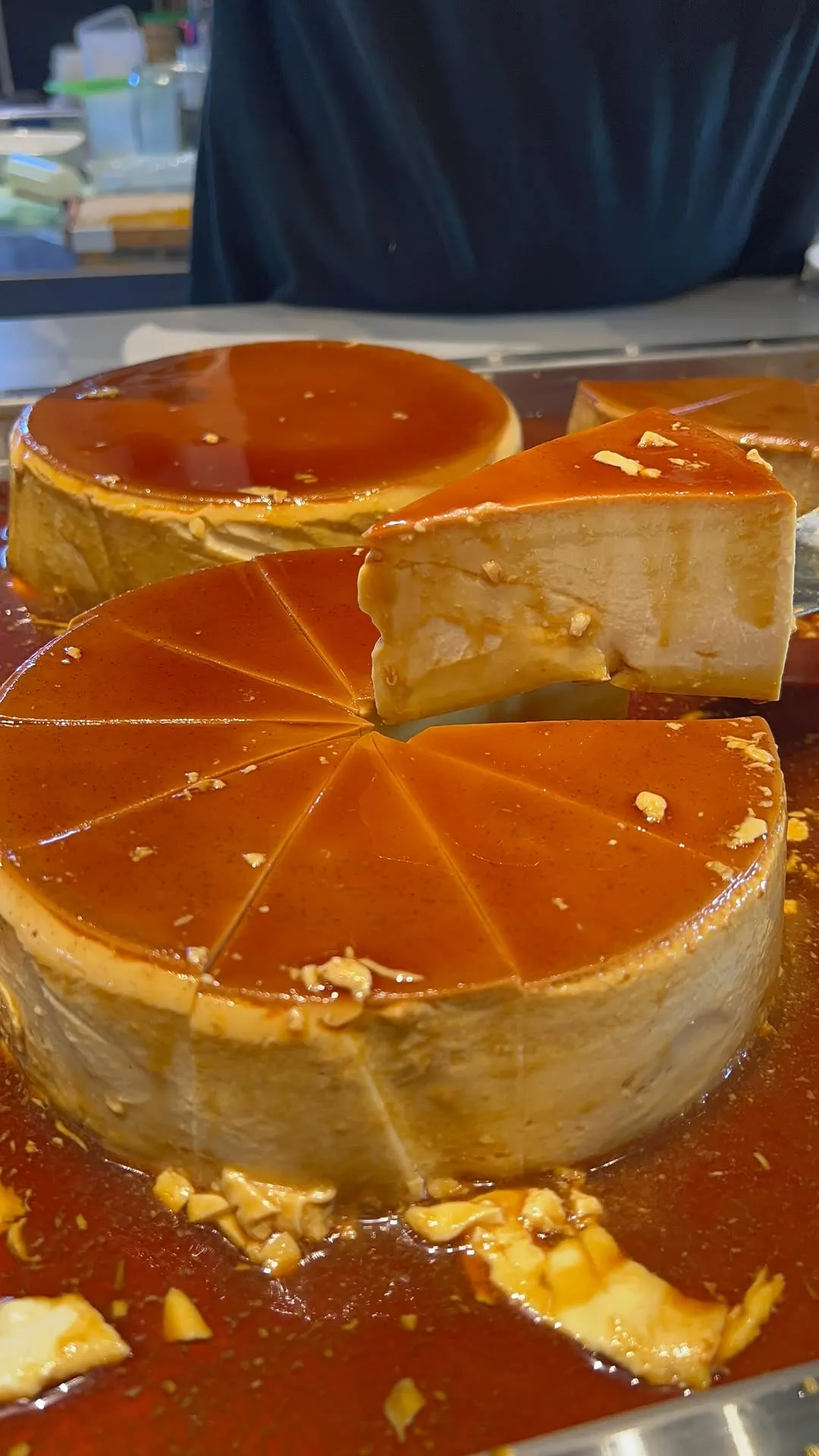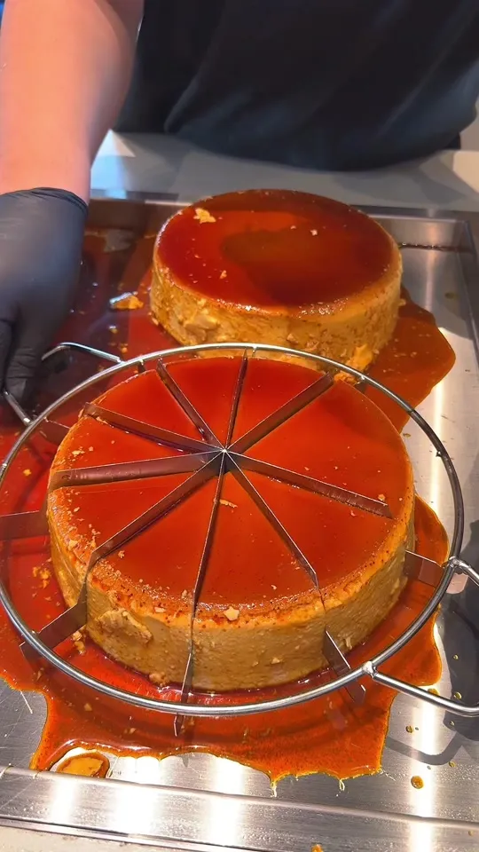 大きな鍋で作った巨大プリンをケーキのように切り分けて表面をこんがりとブリュレしてか...