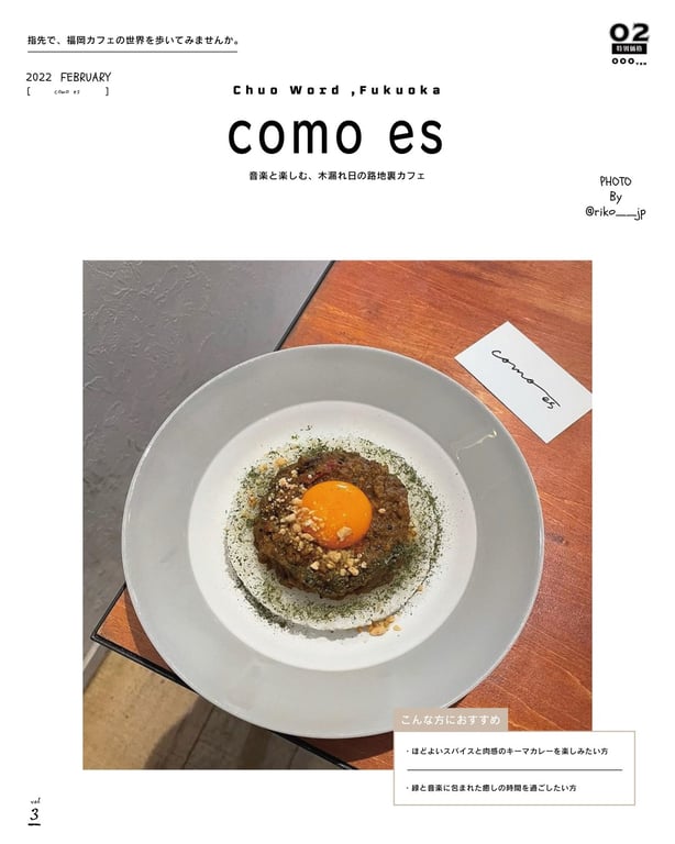 Como esは、今泉の隠れ家カフェ。木漏れ日が差し込む路地裏の落ち着いた空間で、音楽とともに過ごせます。キーマカレーをはじめとする多彩な料理と、グリーンカレー/ハヤシライスが楽しめます。薬院駅から徒歩6分、火曜定休。