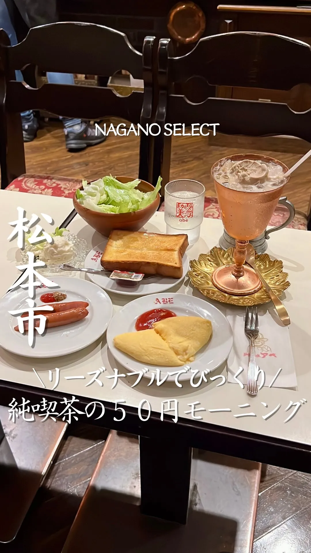 長野県松本市の純喫茶「珈琲美学アベ」は1957年創業。香り高い珈琲とミルクのパフォーマンスが名物で、白黒の昔ながらの雰囲気が特徴です。7:00~10:30のモーニングはサイドメニューが全17品、50円〜100円台とお手頃。松本駅近くの好立地で地元外からも人気です。