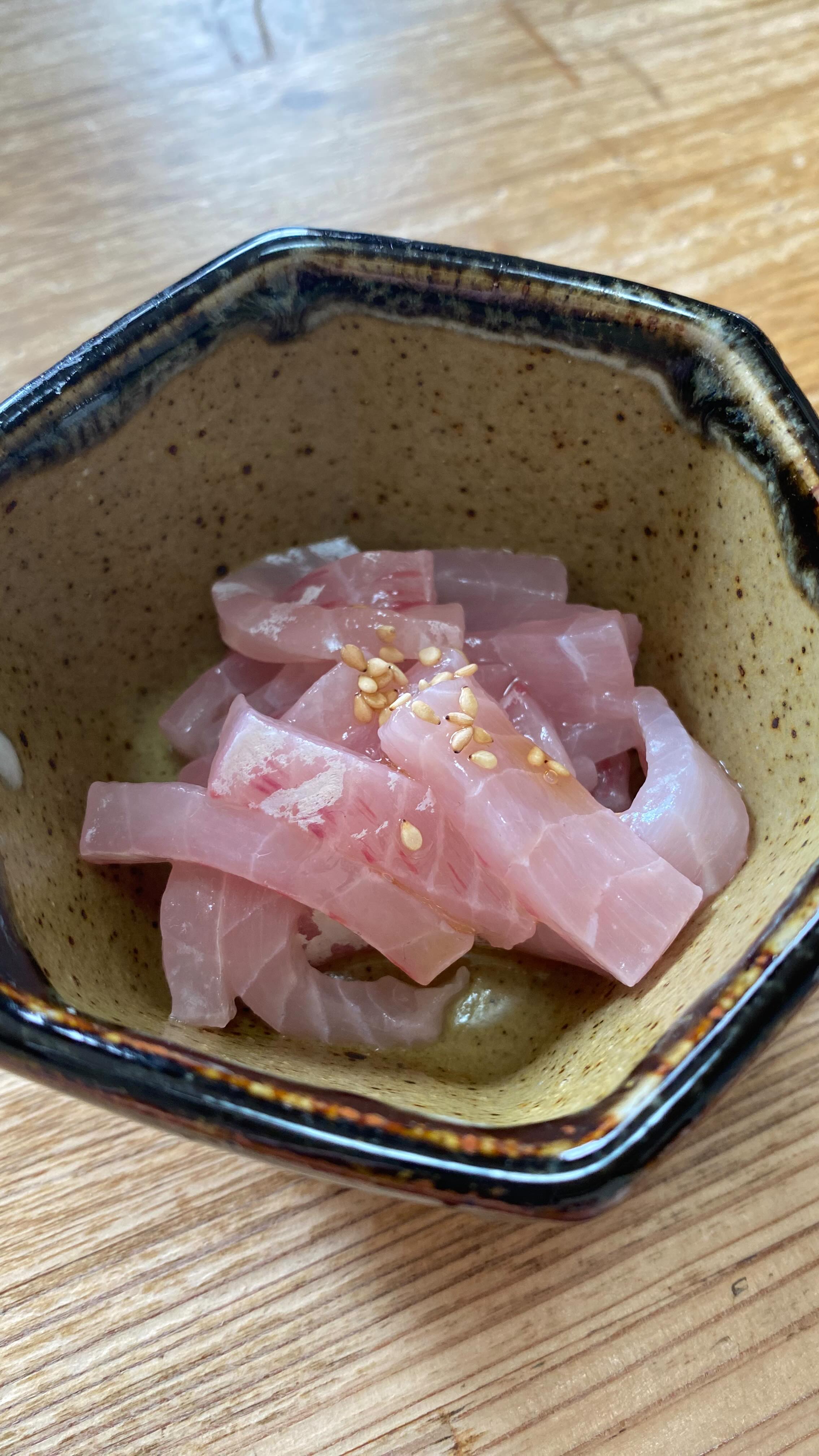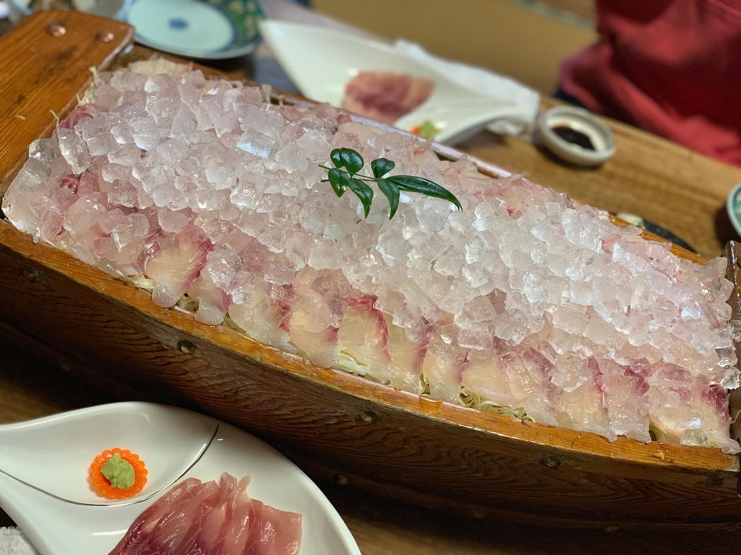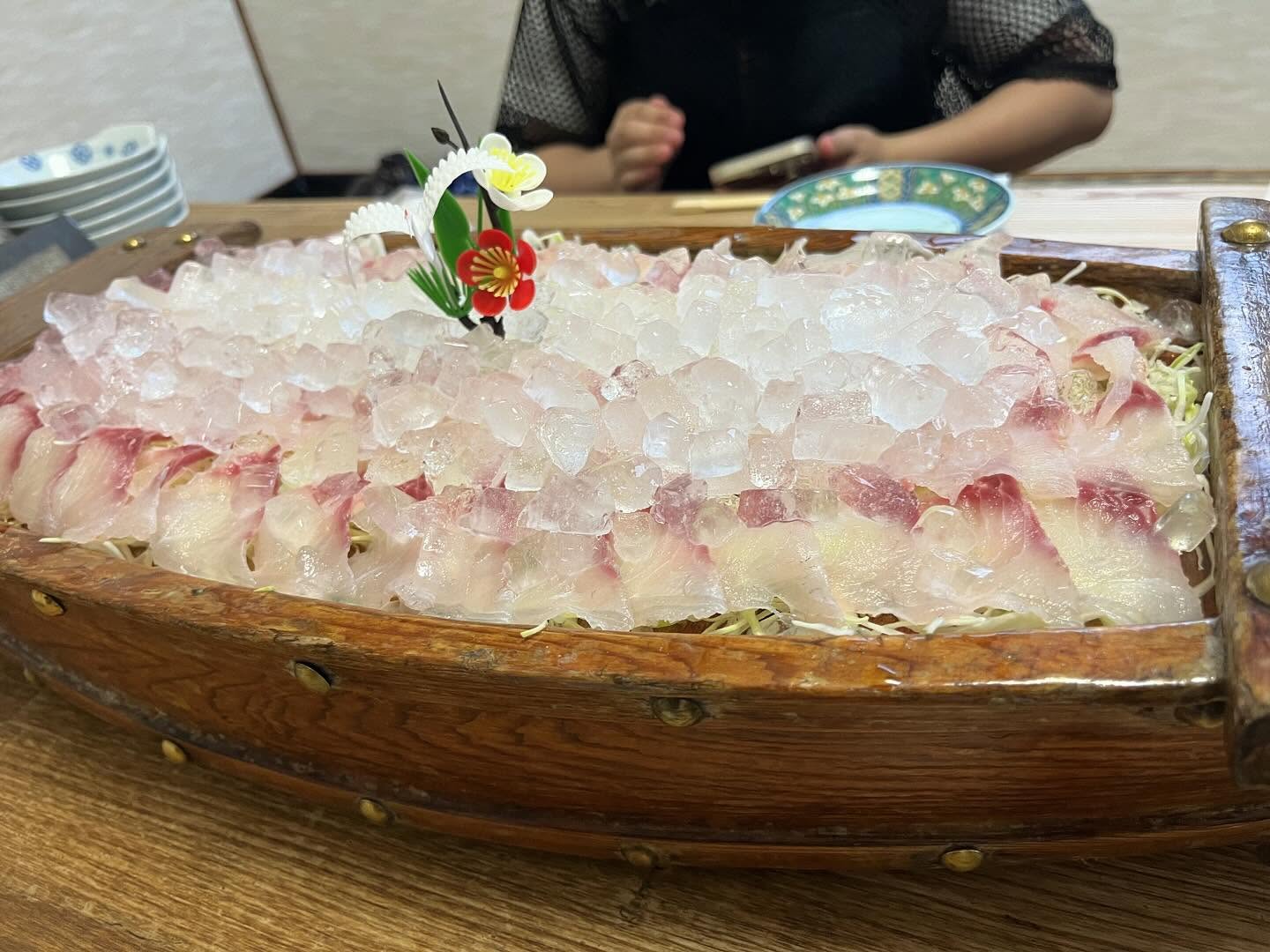 氷がのる、独特のシャリっとした歯応えの冷たい鯉のあらいと窓から見える真っ青な空が夏!って感じ😆