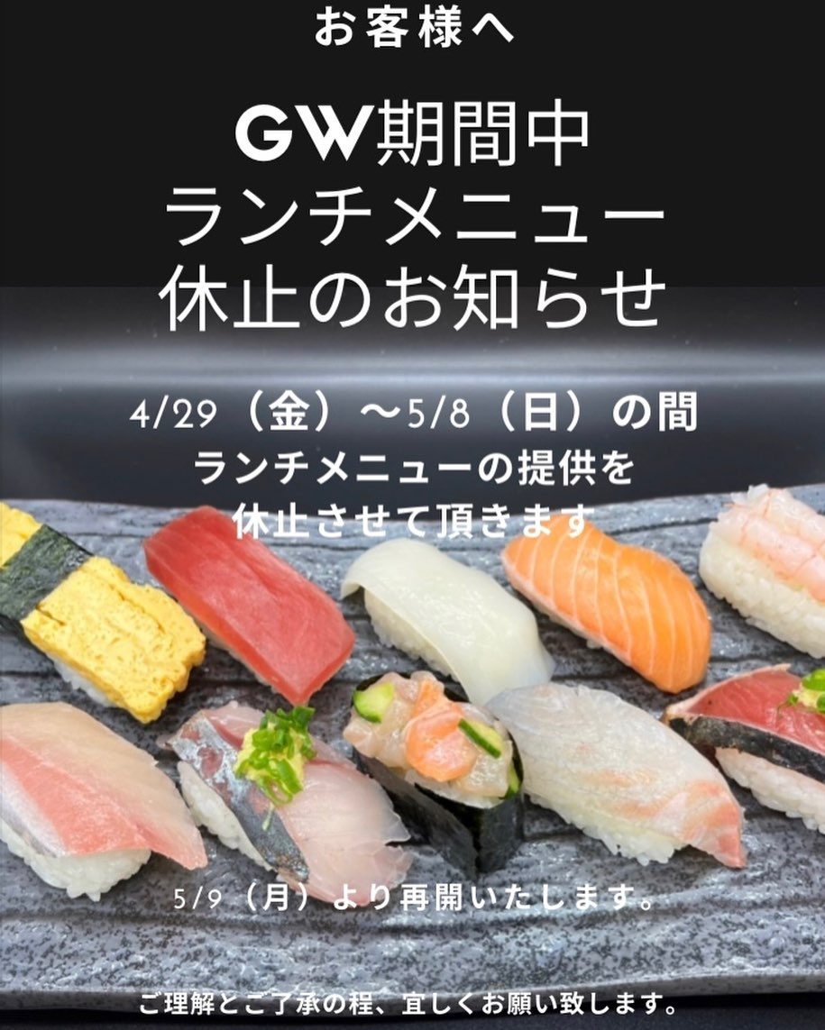 昨日ランチメニューのご紹介をしたばかりですが、ゴールデンウィーク期間中のランチメニュー休止のご案内です。
