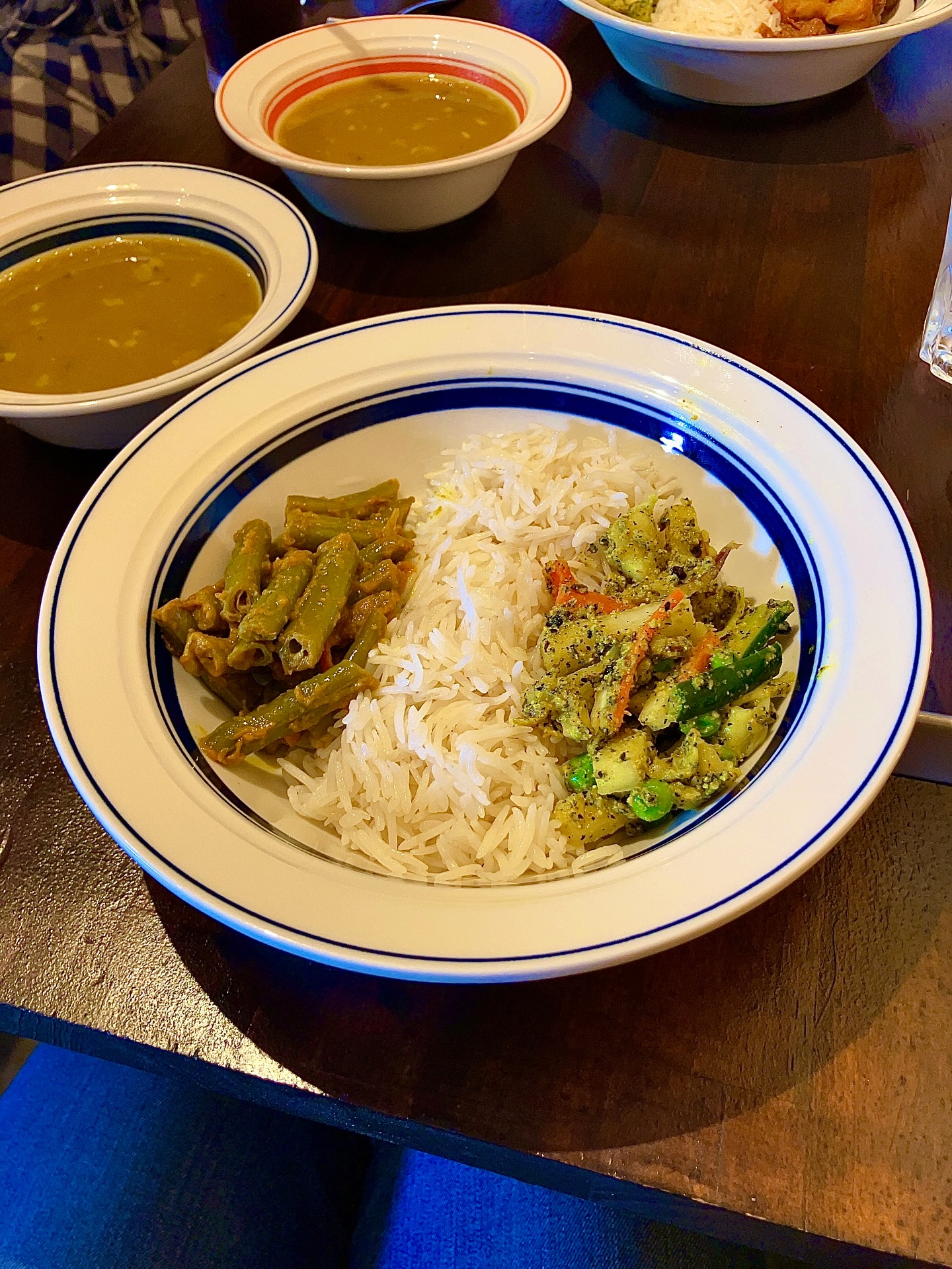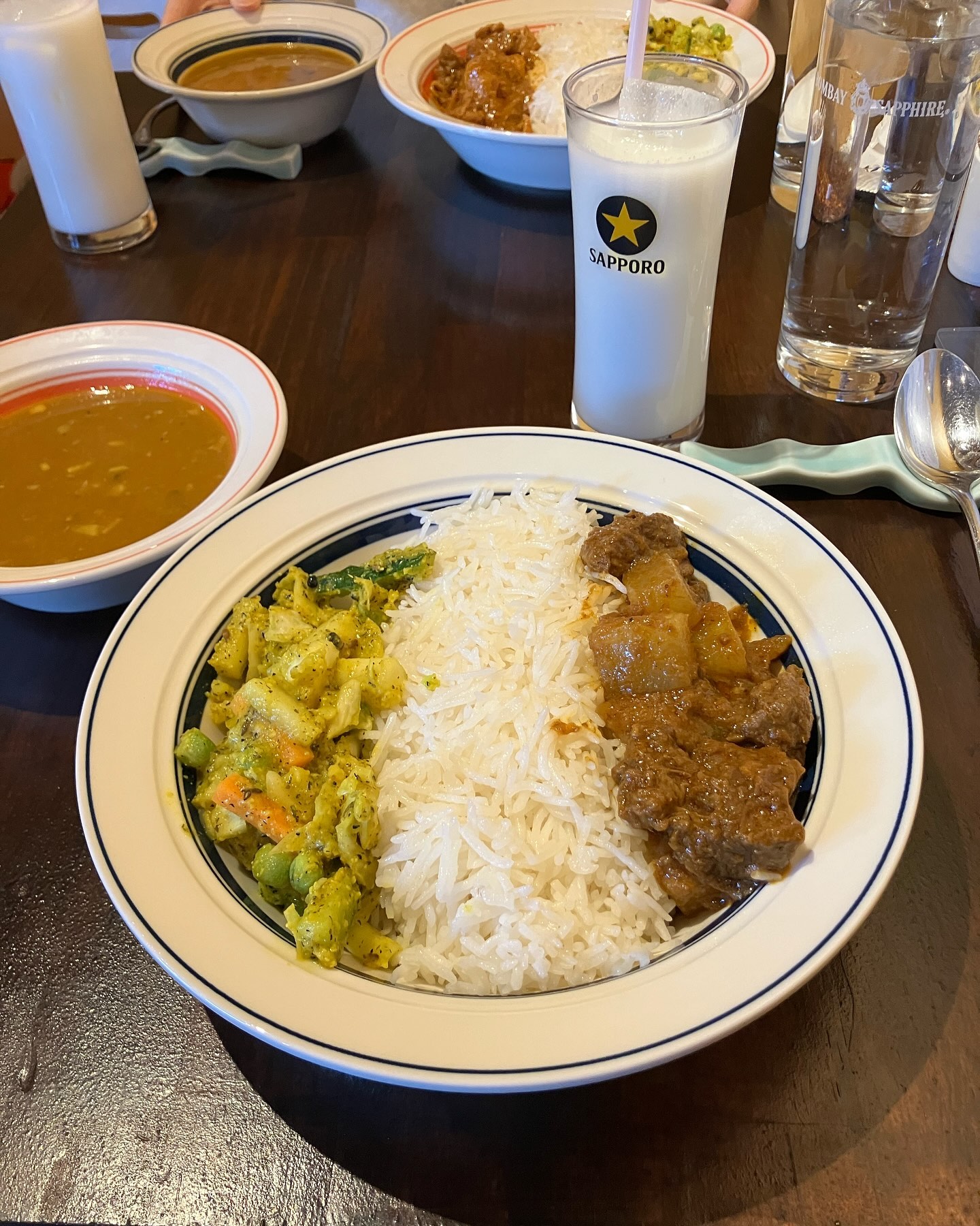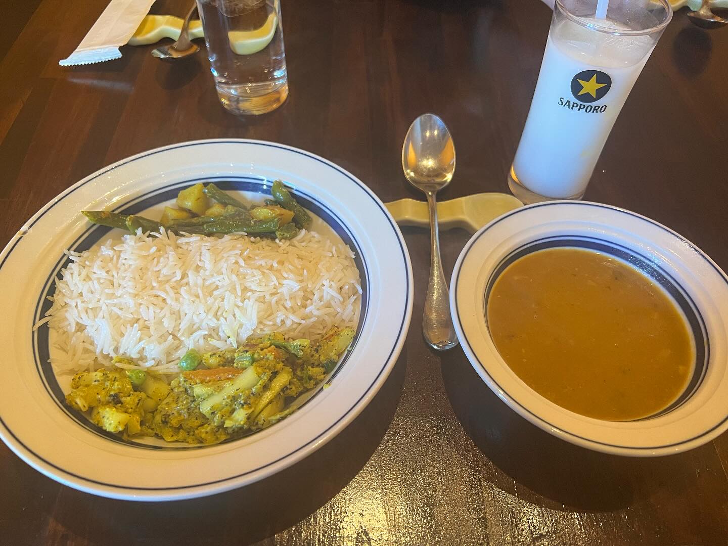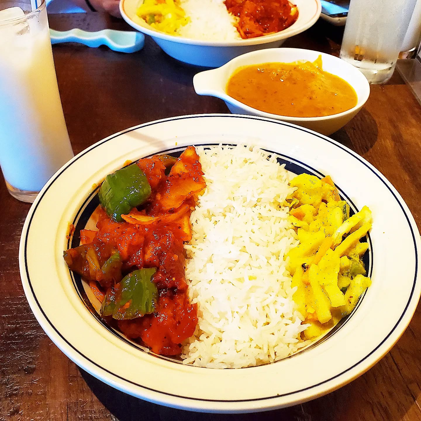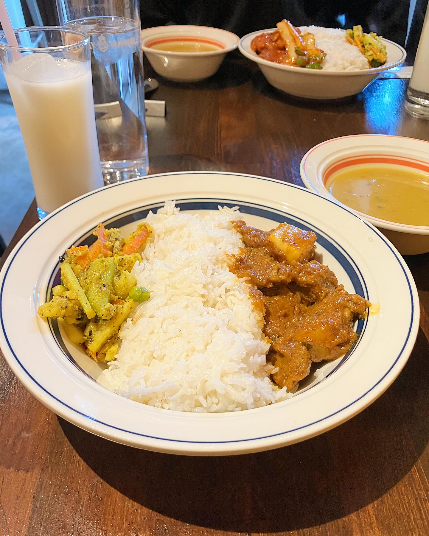 お豆たっぷりのダルスープをお米にかけながらぐしゃぐしゃ混ぜてお野菜たっぷりとスパイス身体に取り込んで