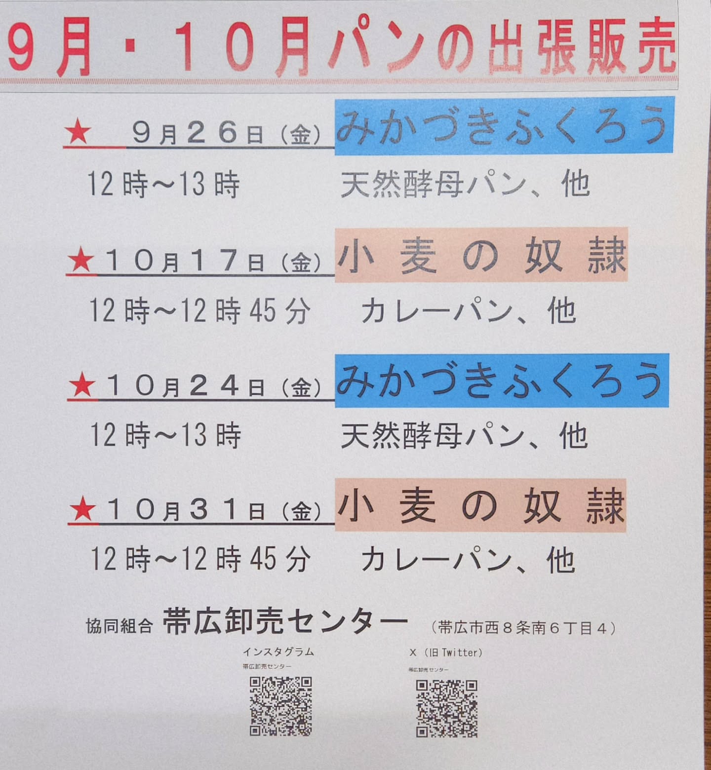 今月〔11月〕の出張パン🍞屋さんのお知らせ‼️ #みかづきふくろう #小麦の奴隷 @mikazukifukurou_2007 @komuginodorei #出張パン屋 #パン屋 🔷帯広卸売センター〔帯広市西8南6-4 〕