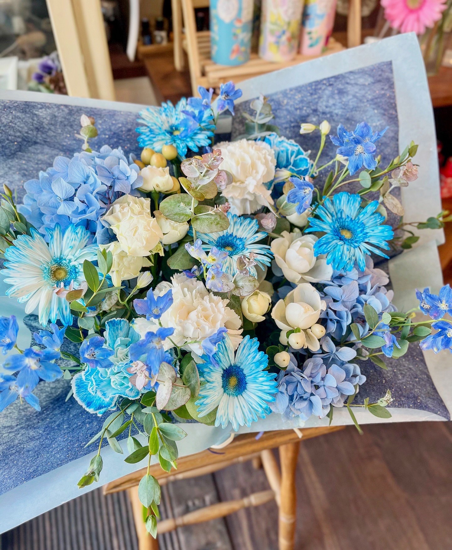 ブルーのガーベラやアジサイ