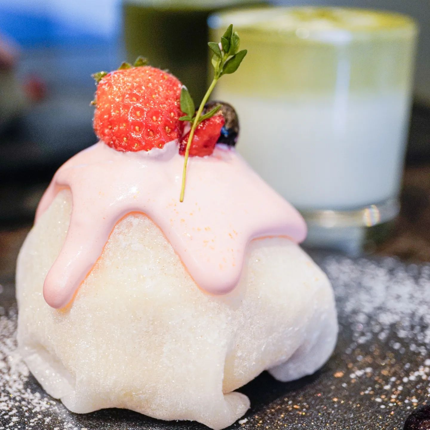 仙台・勾当台公園駅近くのWAVYは、明るく居心地の良い空間が魅力です。いちご大福といちごケーキの融合スイーツ「冬のキラもち大福」や抹茶ラテなど、求肥とスポンジ・白餡イチゴのハーモニーを楽しめます。黒い鏡の背景で写真映えも抜群です。