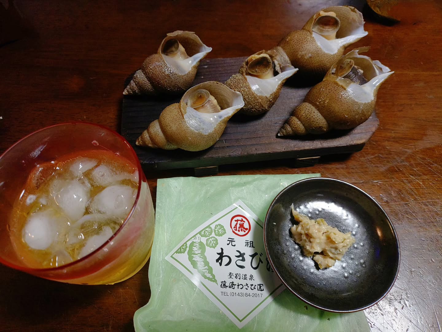 晩酌。木村さんで売ってた煮ツブと、藤崎ワサビ園のわさび漬で、晩酌♥️♥️♥️‼️
