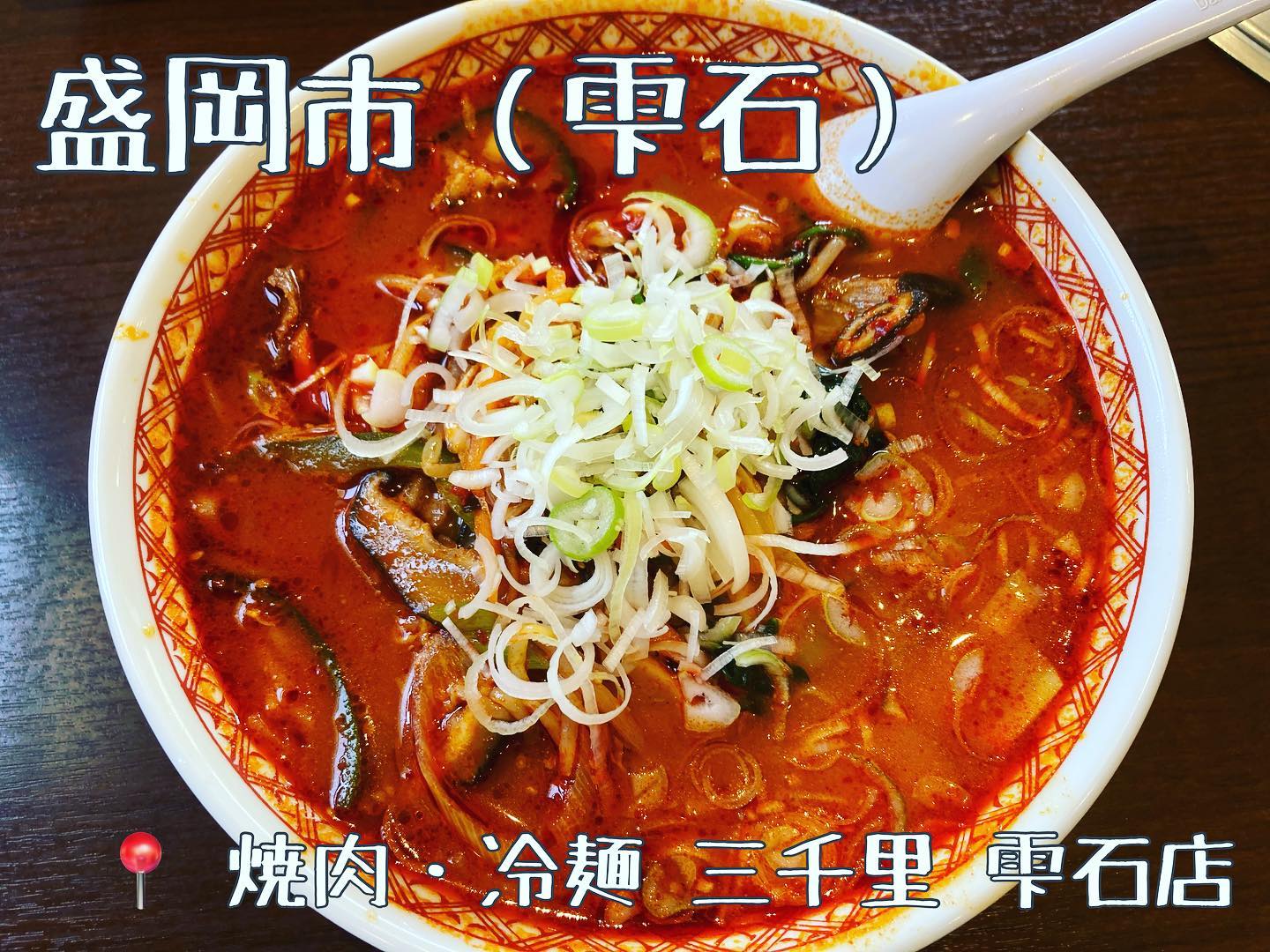 岩手・雫石の名店、焼肉・冷麺・ラーメンの三千里。看板メニューはカルビスープラーメンで、牛骨と鶏ガラのコクあるスープに辛味と野菜出汁が効く。冷麺はさっぱり系ながら麺のコシが強く喉ごし良好。百名店認定の実力店です。