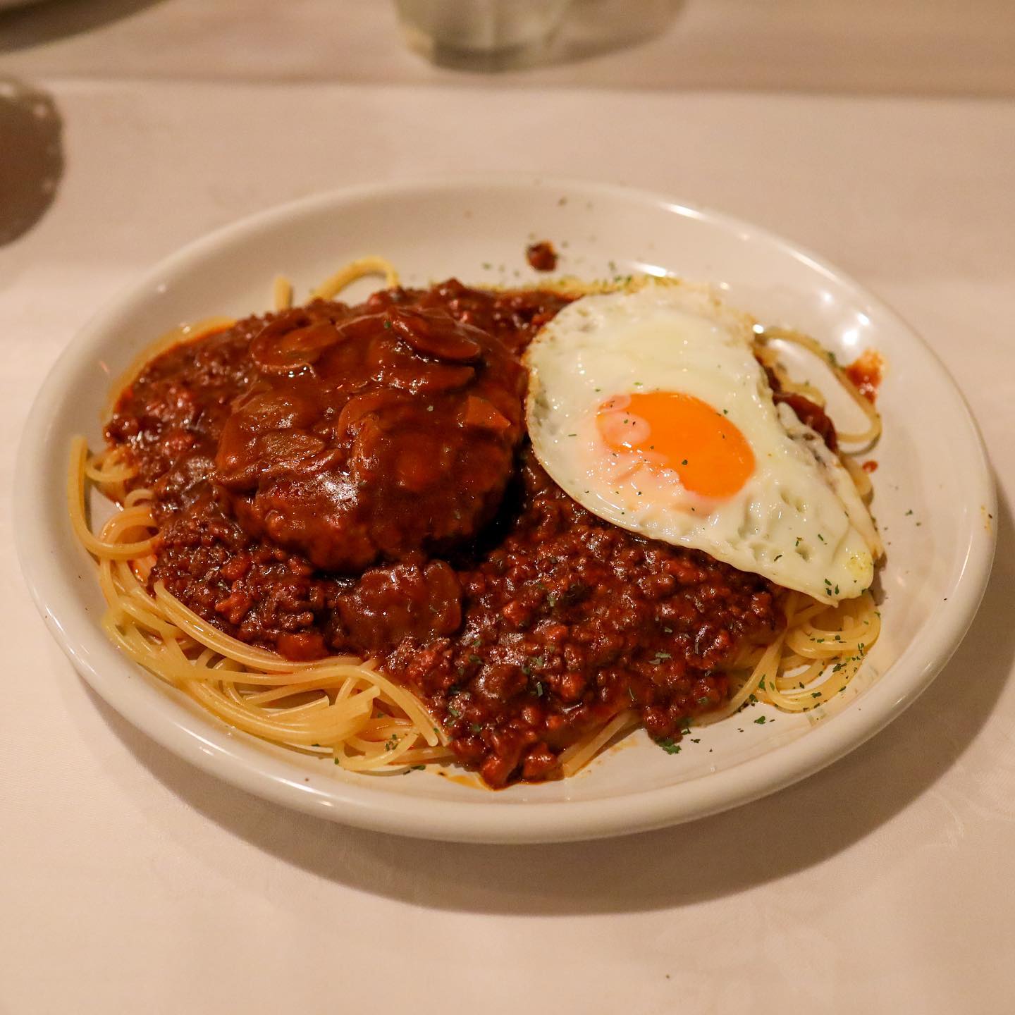 『ハンバーグと目玉焼きのミートソース』