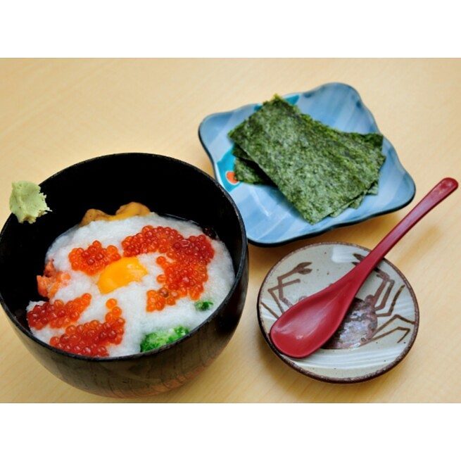 まぐろ、うに、ホタテ、いくら、等の上に、とろろ、オクラを乗せております。海苔を巻いてお召し上がりください!!