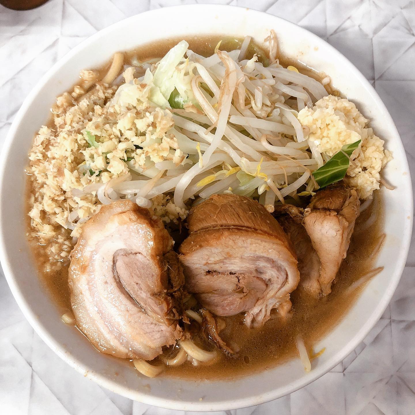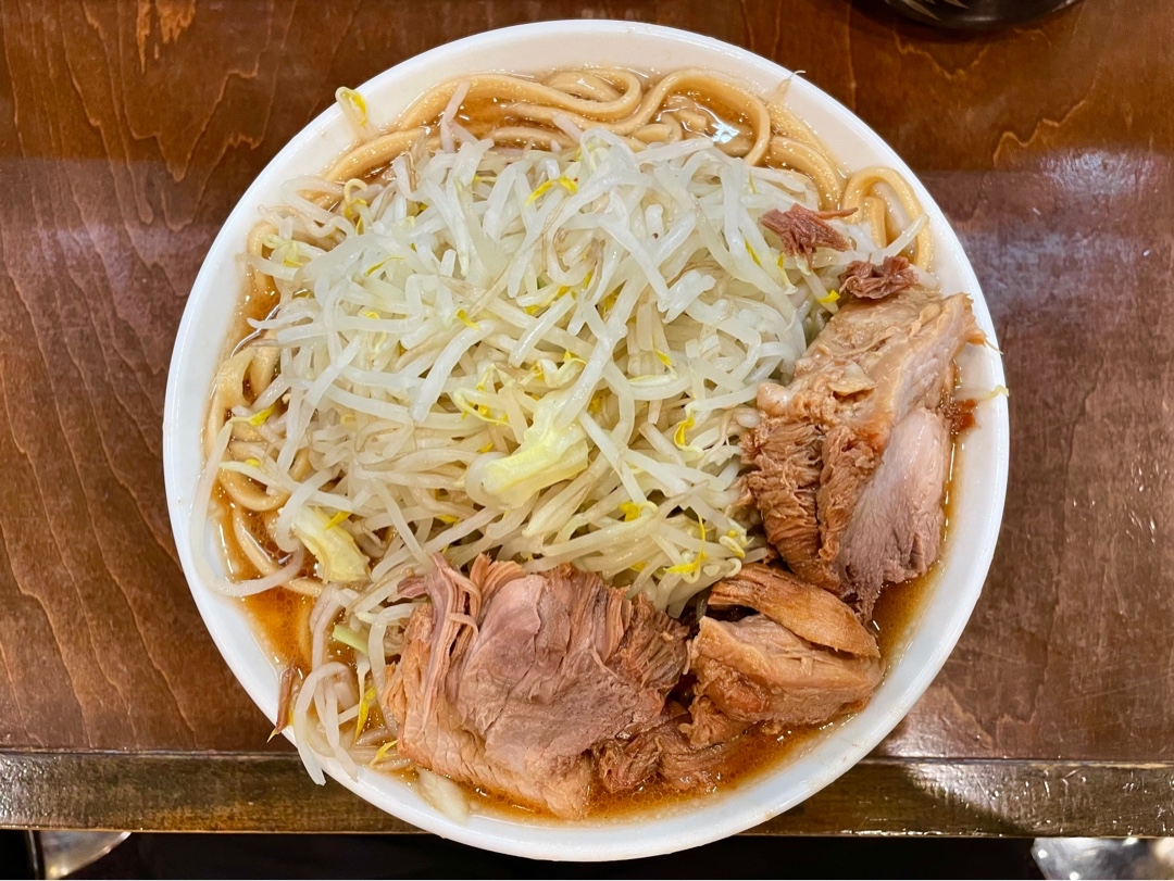 淵野辺の麺屋歩夢は完全オリジナルの二郎系インスパイア。自家製の平打ち太麺はツルッと歯ごたえ良く、カエシが効いた味わいとブラックペッパーが特徴。豚は大きく柔らかく、アブラの旨味とニンニクの風味が相性抜群。野菜はシャキ感あり。