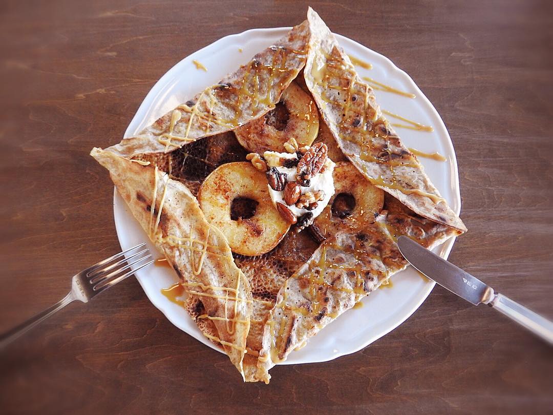 美味しいガレット見つけた‼︎もちもち生地に甘酸っぱい林檎、クリームチーズ&塩キャラメルって最高🍎...