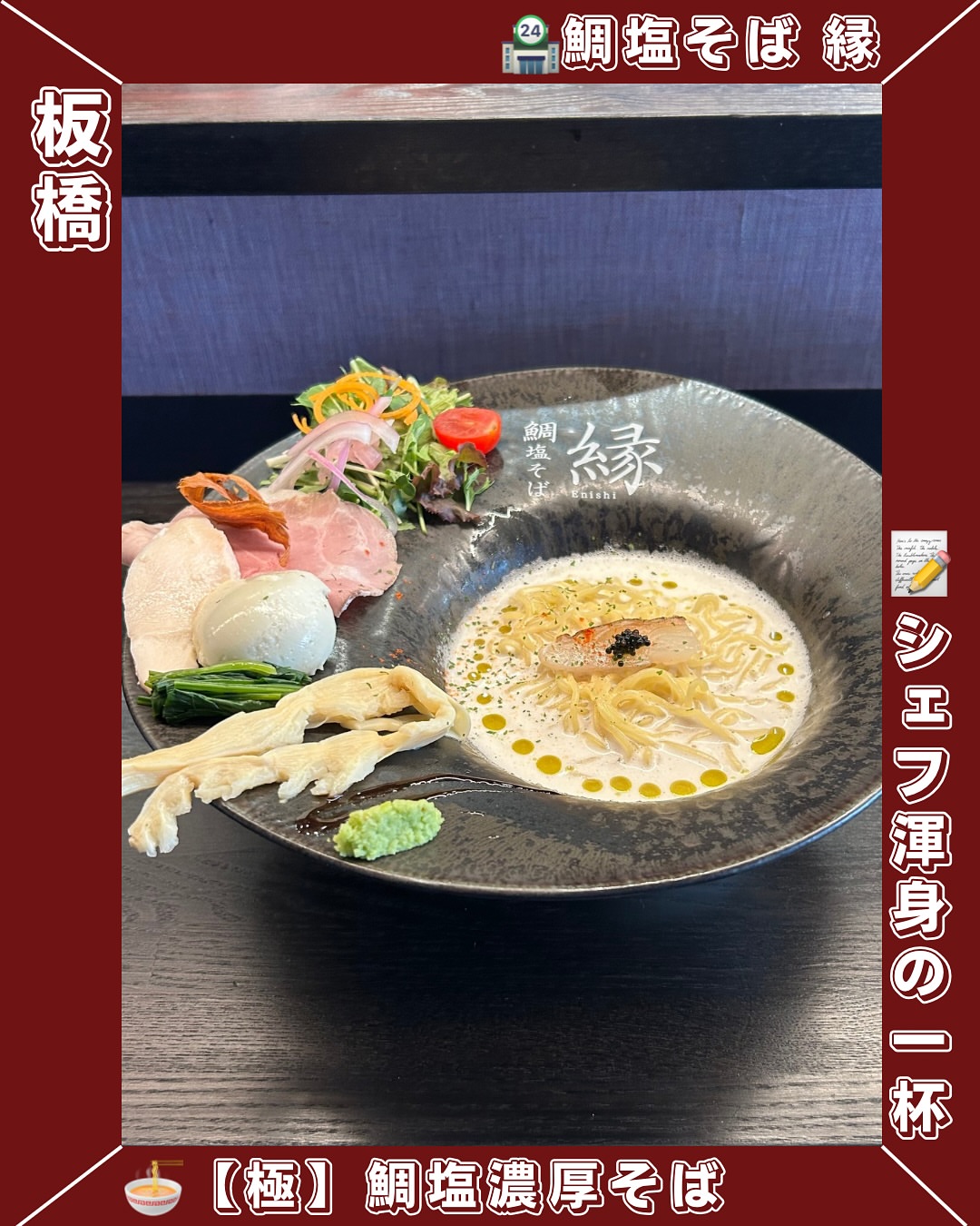 東京都板橋にある「鯛塩そば 縁」にて、【極】鯛塩濃厚そばをいただきました。