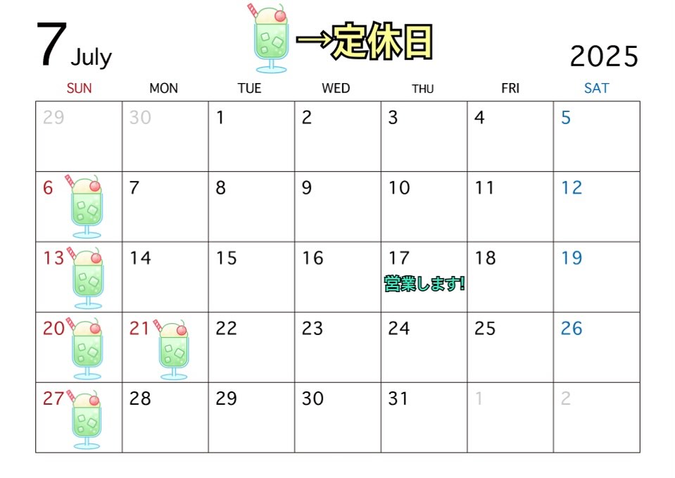 7月に入って10日も経っているのに定休日のお知らせをすっかり飛ばしておりました💦