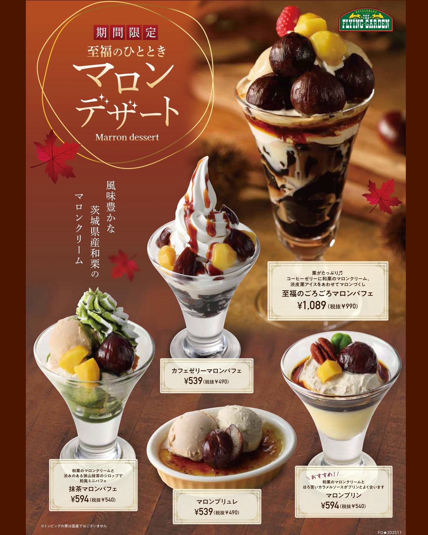 #フライングガーデン 全店で茨城県産和栗のマロンクリームを使用した「マロンデザート」が期間限定で登場🌰✨