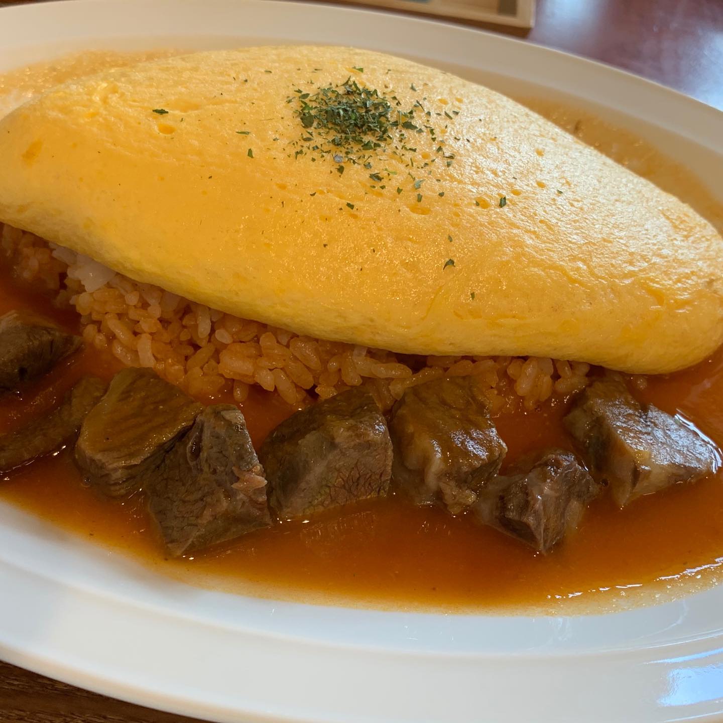 半熟とろとろのオムレツの真ん中をカットして、ゴロゴロ牛肉とトマトピラフを絡めていただ...