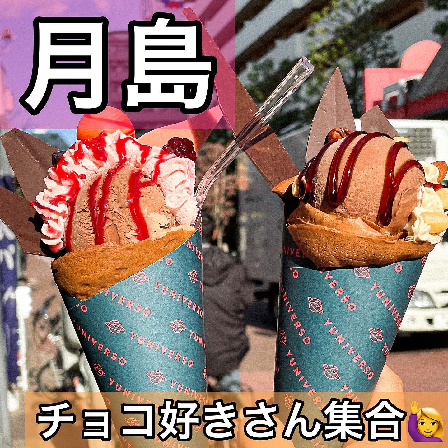 月島のショコラトリ―YUNIVERSOは、昭島市の工房で手作りされるショコラをふんだんに使う大人のチョコクレープ専門店です。生地もクリームもチョコづくしで、9種のクレープはボリューム感あり。店内では作る様子も楽しめ、ショコラ菓子も並び、外にはベンチ席も。