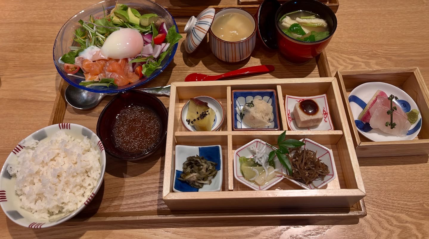 ランチに北千住丸井にある、京都二条茶寮のスプーンで食べるサーモンの温玉サラダ膳➕追加に鯛のお造り...
