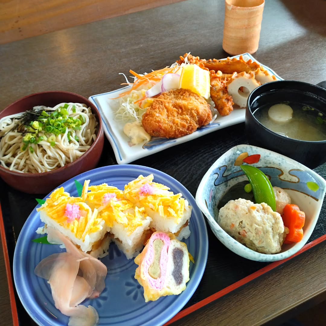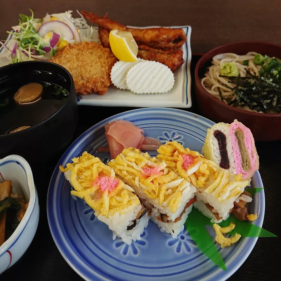本日のランチは、ロード銀山のここだけ定食。箱寿司、紅白の天ぷら饅頭、沖イワシ‥大田満載です❗