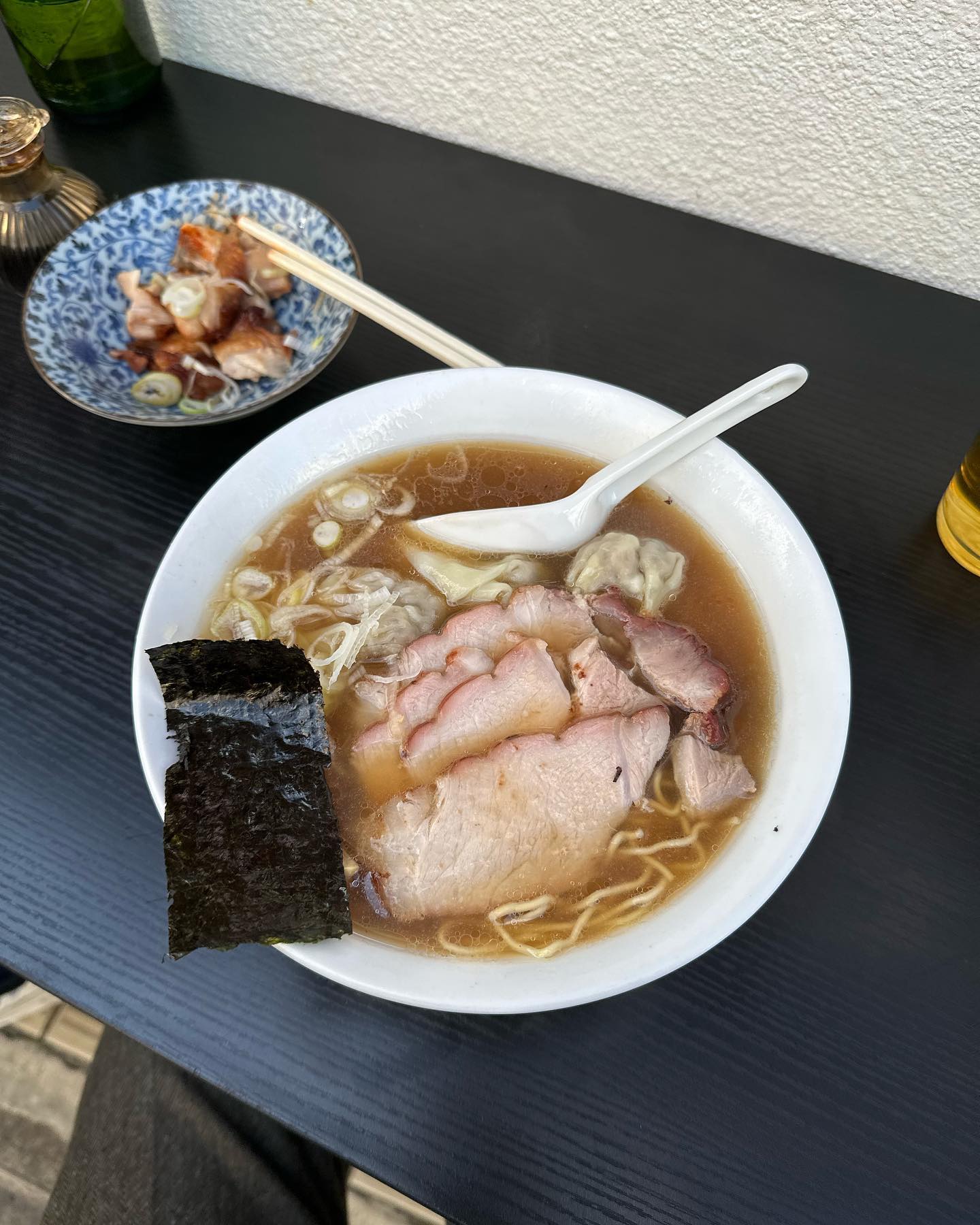 @edwina_horl さんがやっている経堂のラーメン屋 @harubarutei_salon に。外のベンチでビールとつまみとワンタンチャーシーメンを。美味...