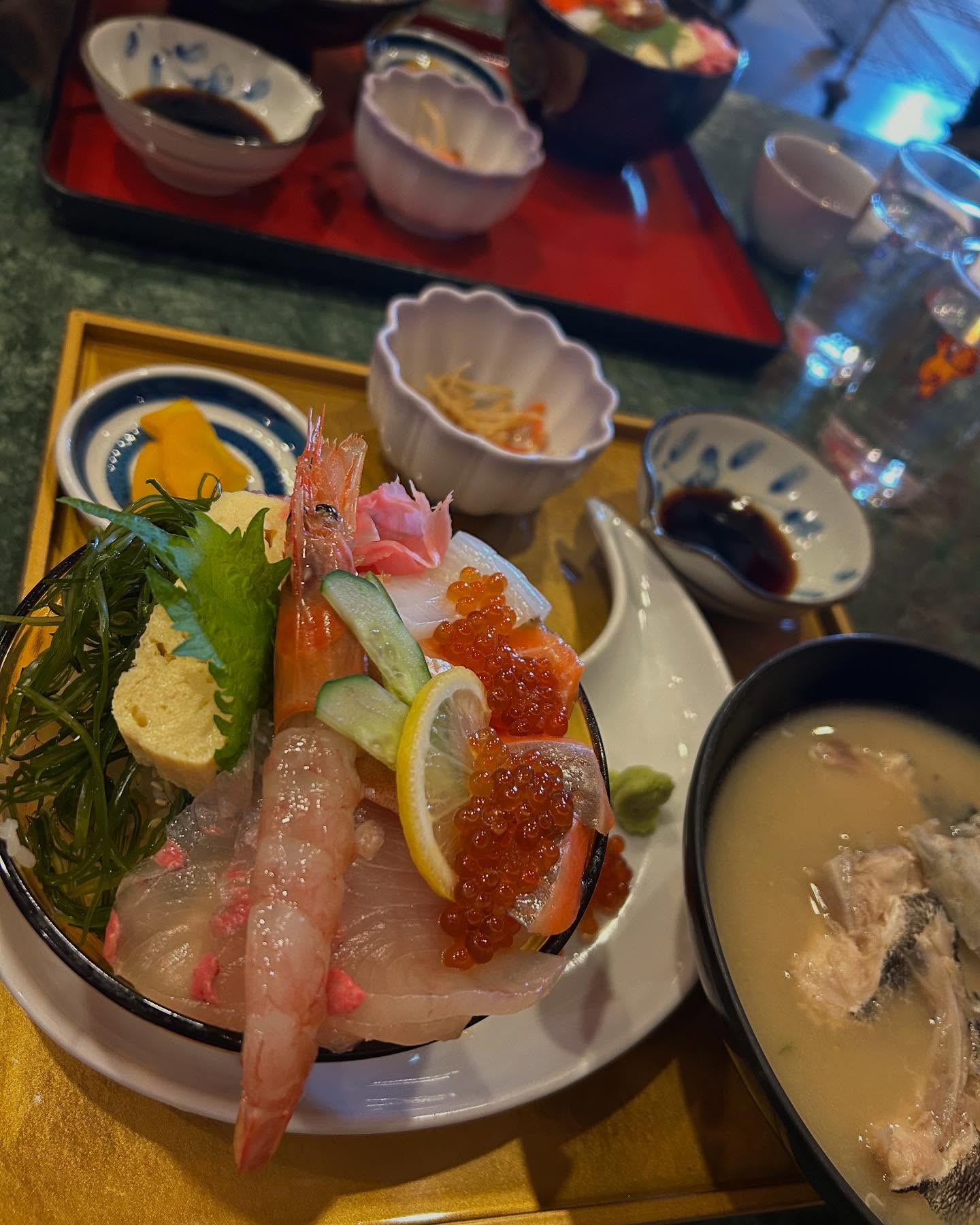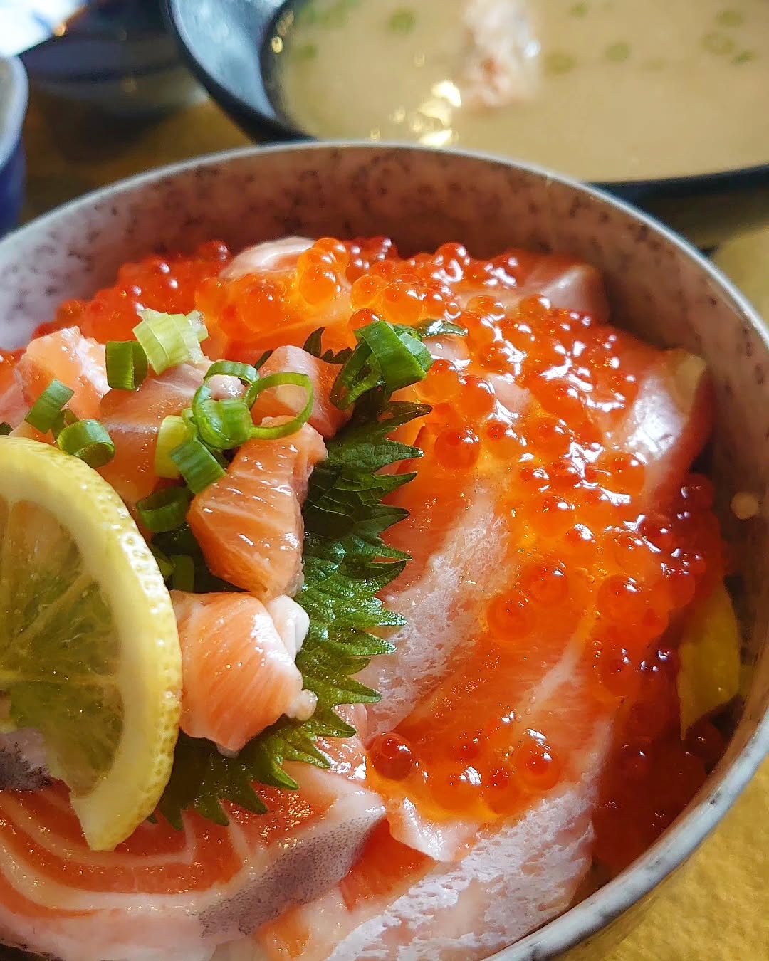 生トロサーモンいくら丼とあら汁を食べて