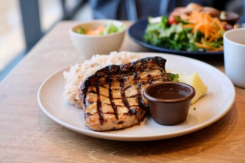 THE OUTLETS SHONAN HIRATSUKA 2階のFLOWS GRILL BARは、豊富なグリル料理が魅力のダイニングです。サラダプレート(スープ付)や塩麹グリル豚など、野菜と肉の組み合わせが楽しめ、付け合わせのシルクシートが印象的です。