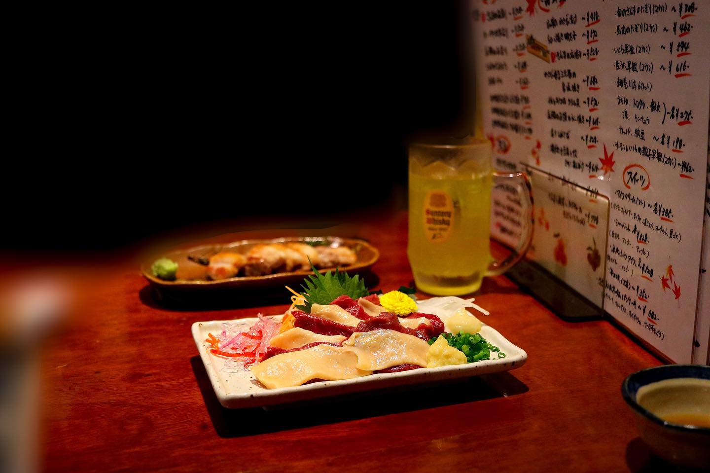 さざん屋はさざんファンの聖地として愛され、さざんグッズやBGMが楽しめます。新鮮な馬刺し2種盛りと色鮮やかなたてがみ、煮物のお通し、手羽先唐揚げ、生牡蠣と焼き牡蠣の食べ比べ、雲丹といくらの肉巻き、締めはアンチョビガーリックピザが名物です。
