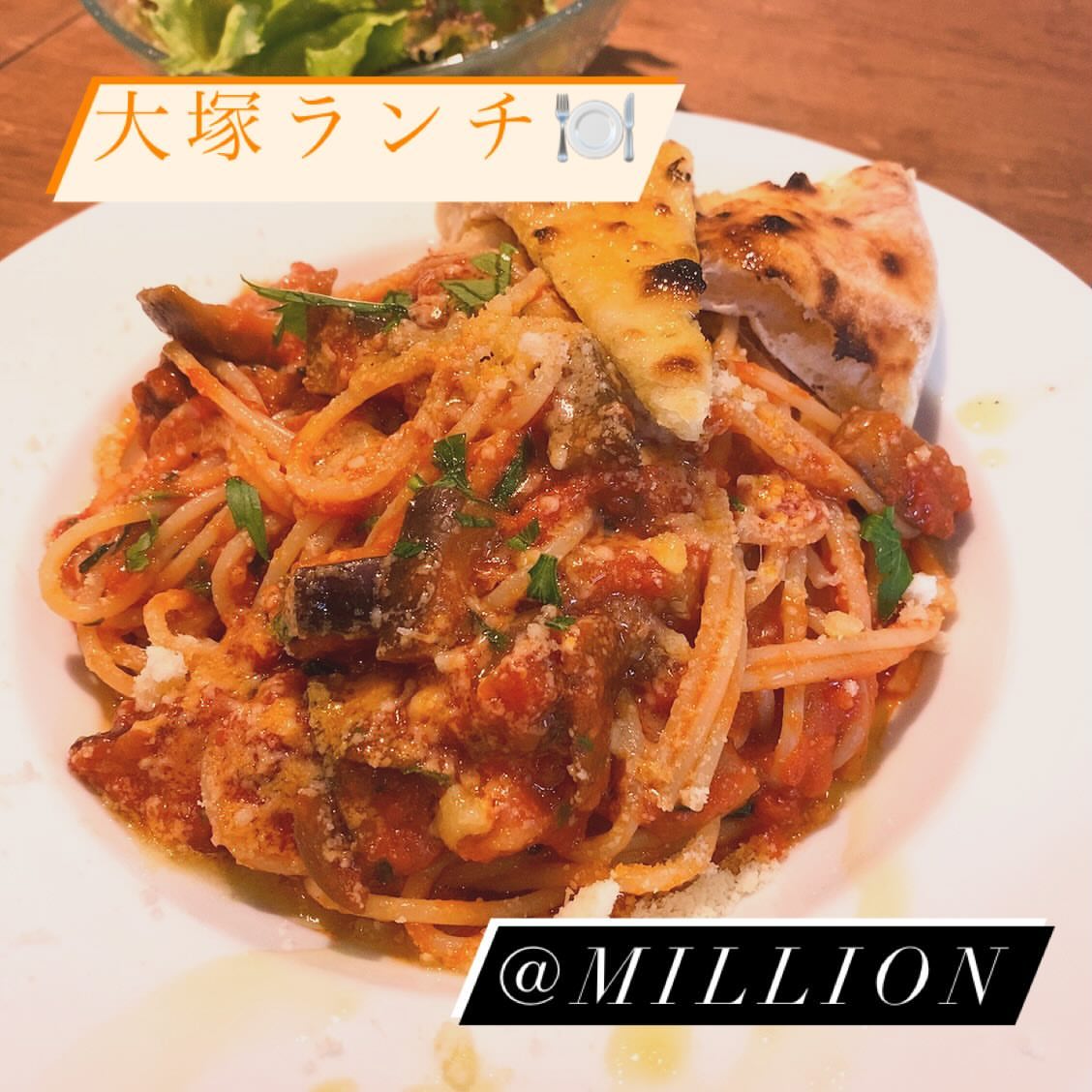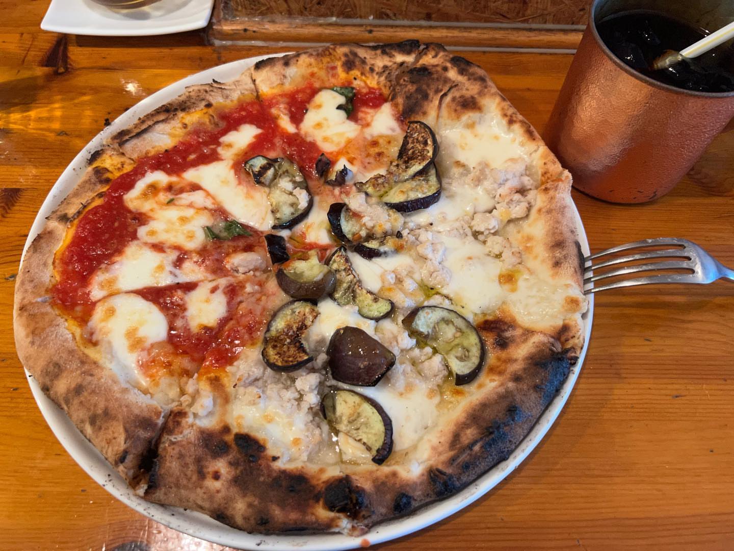 東京要町にあるMILLION DORRAR CAFEで、石窯焼きピッツァセット(サラダと、鶏ひき肉と茄子のオイルソースとマルゲリータのハーフ&ハーフと、アイスコ...