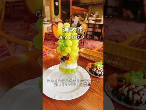 須坂温泉古城荘内にあるカフェSHIROです。庭園を望むラウンジで、須坂産のぶどうを使ったパフェや季節の果実スイーツが楽しめます。シャインマスカットときめきパフェは3800円。駐車場あり。11時〜17時、定休日は水・土。要予約です。